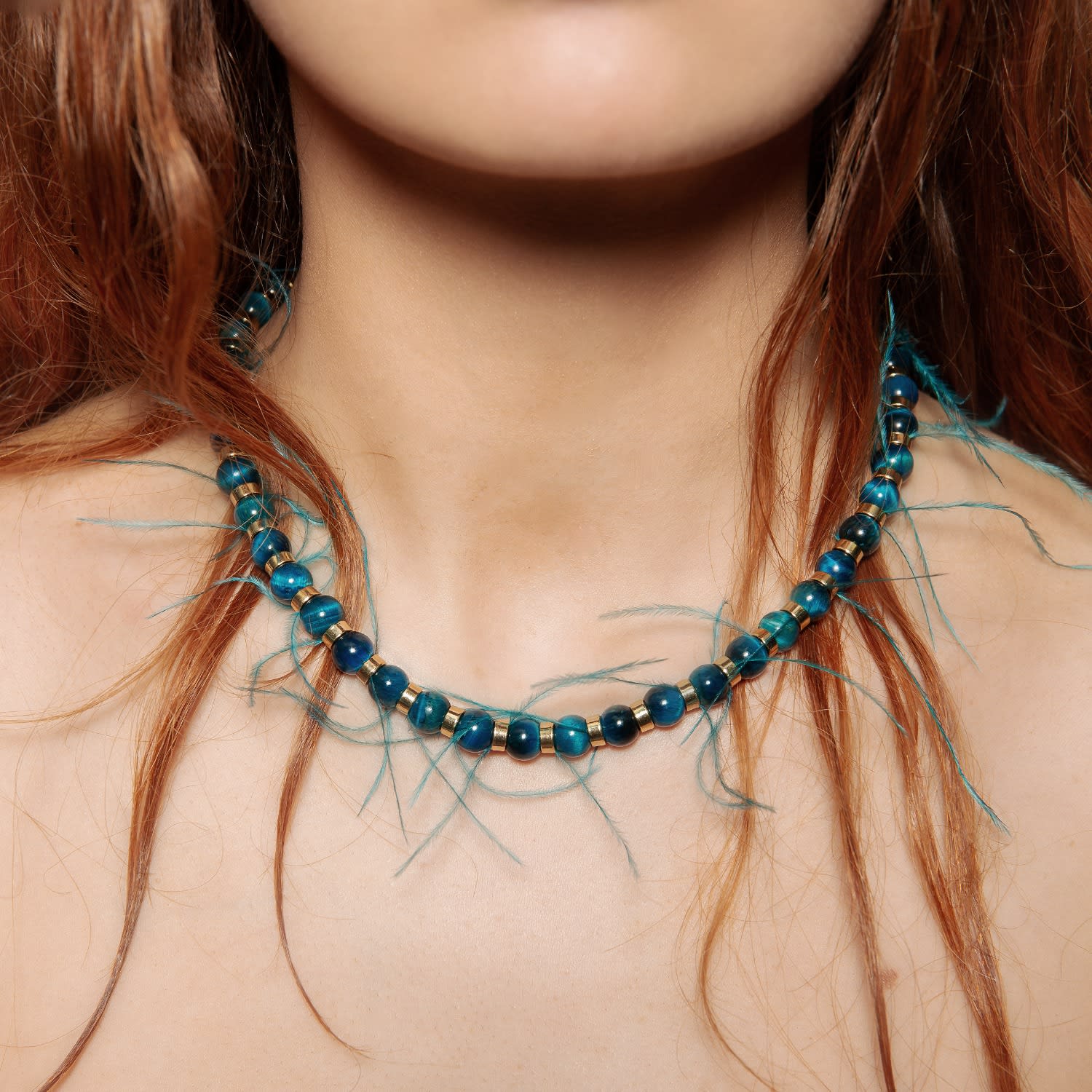 This Abyss Handcrafted Statement Necklace by Babaloo Jewelry is a bold and unique accessory. It features deep blue tiger's eye beaded stones with a mesmerizing chatoyancy, accented with delicate feather details. The combination of natural stone and soft feathers creates a striking contrast, making it perfect for festival fashion or as a standout accessory. It's designed for those who embrace individuality and style.