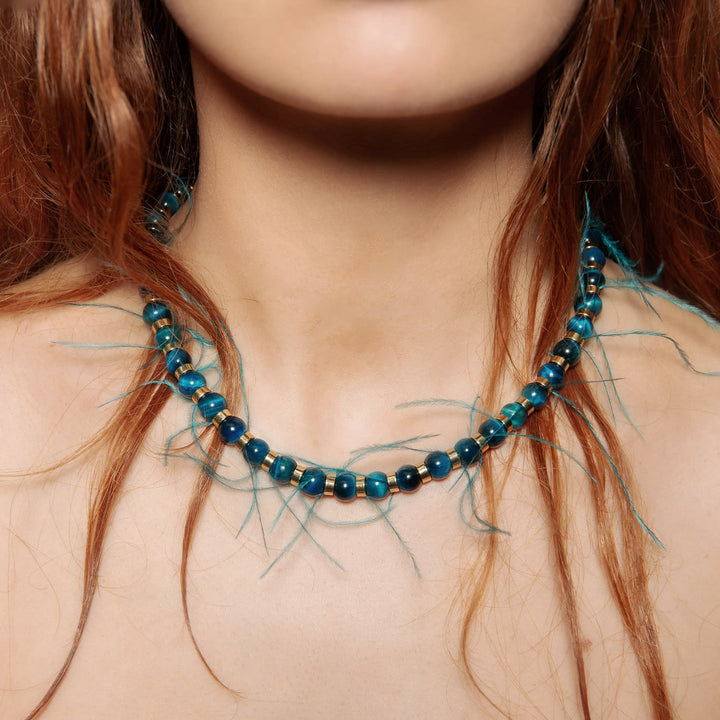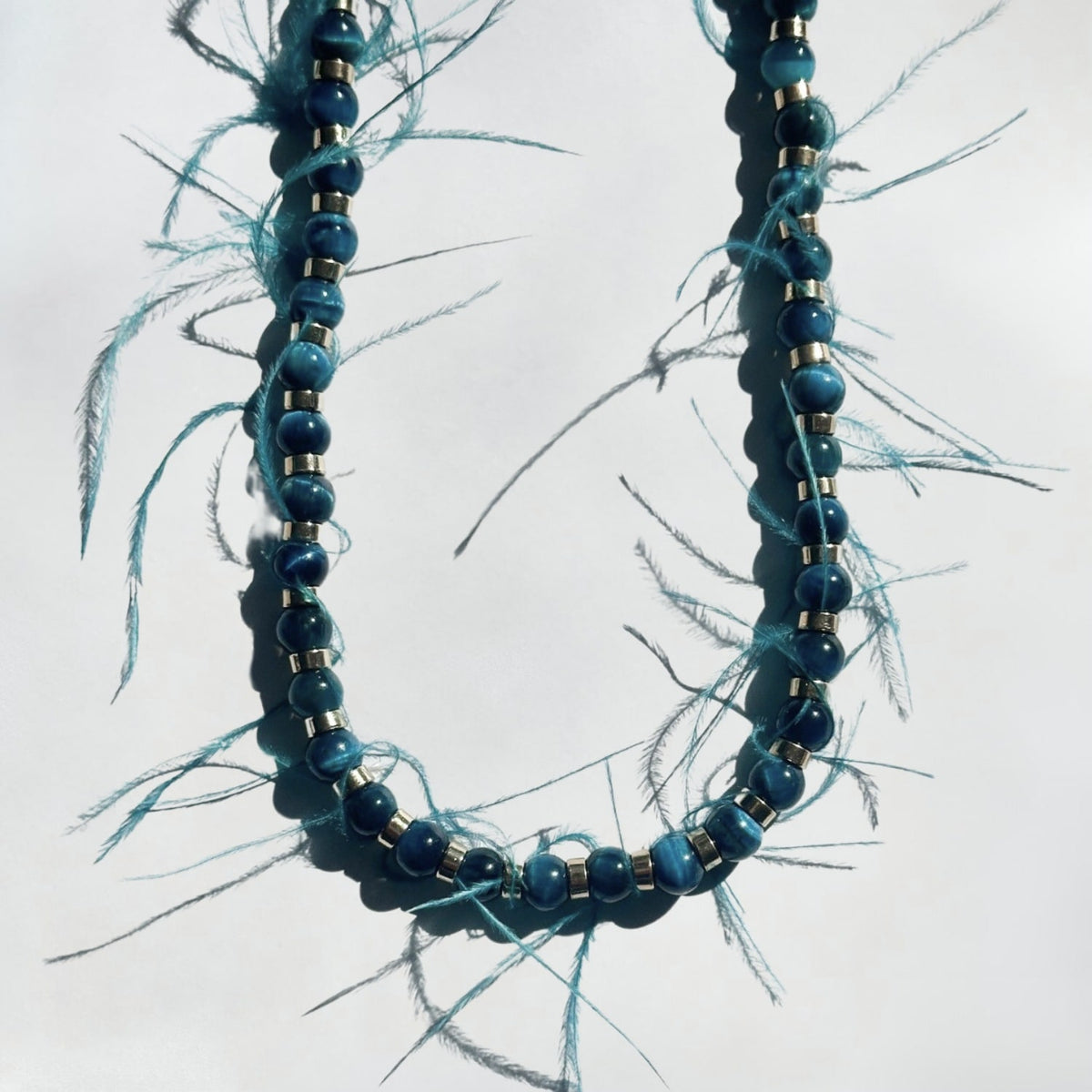 This handcrafted necklace features blue tiger's eye beaded stones with feather details.
