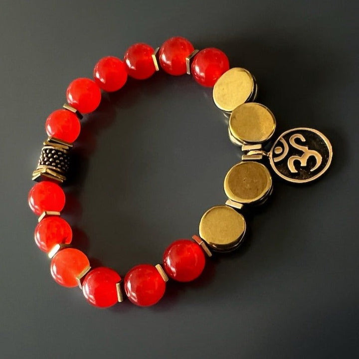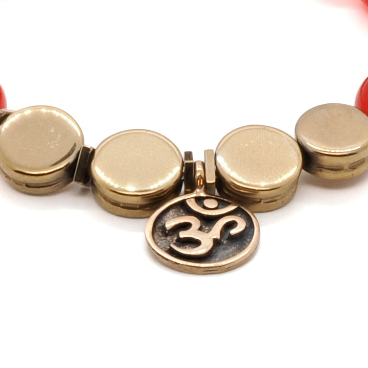 Handmade with 8mm carnelian beads, gold hematite spacers and beads, and bronze Om charm. Bracelet size: 6.5".
