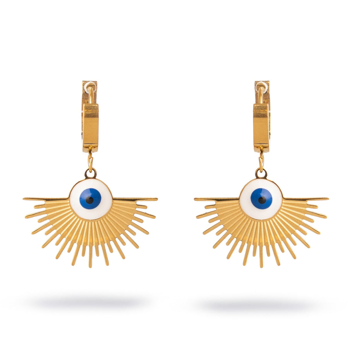 These earrings are made from a stainless steel base with high-quality 18k gold plating. They feature a blue and white evil eye charm.