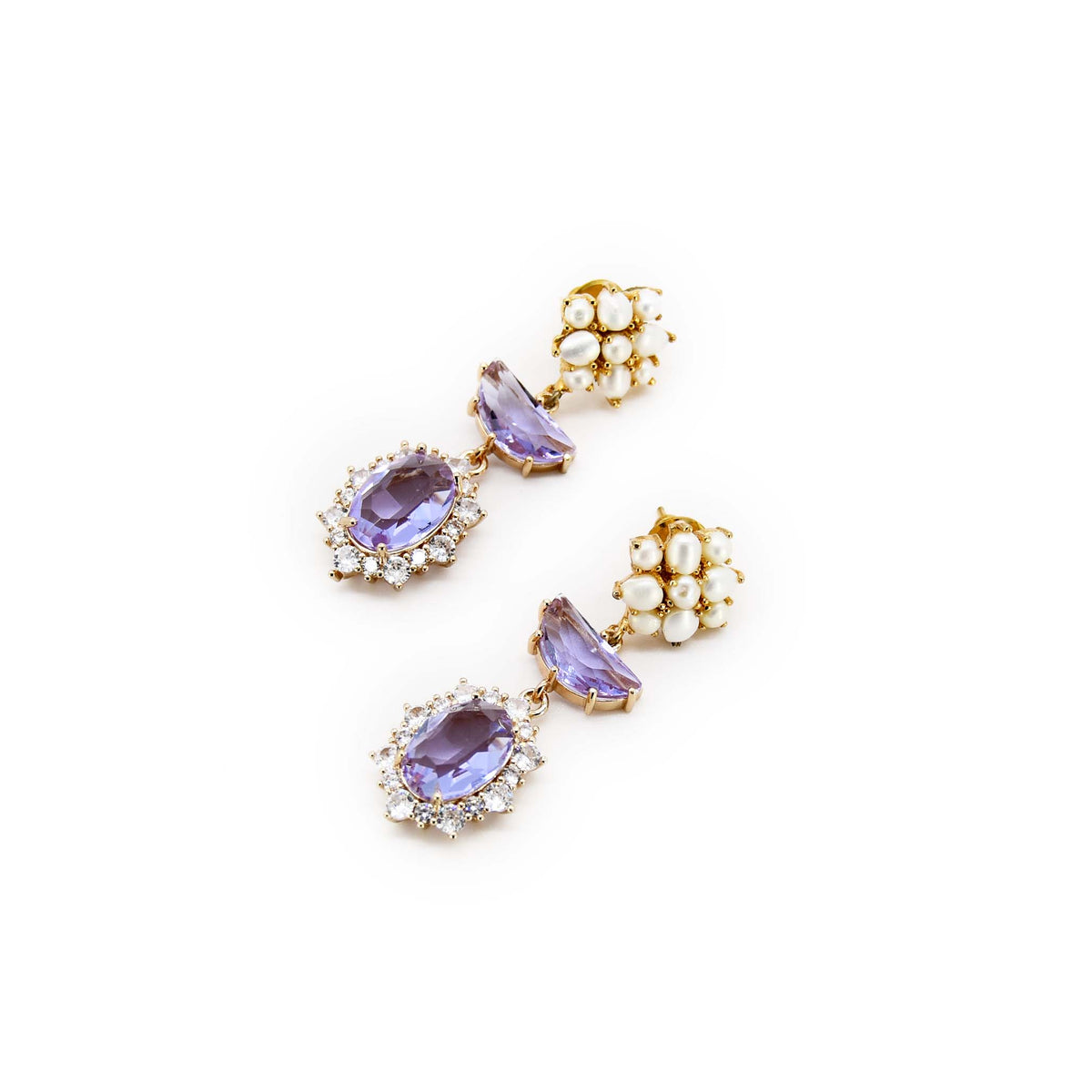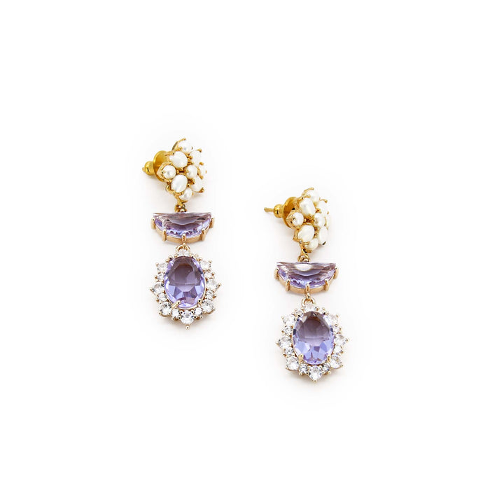 22k gold-plated brass with freshwater pearls, 14k gold bezel, lilac crystals, and pavé cubic zirconia. Nickel- and lead-free.