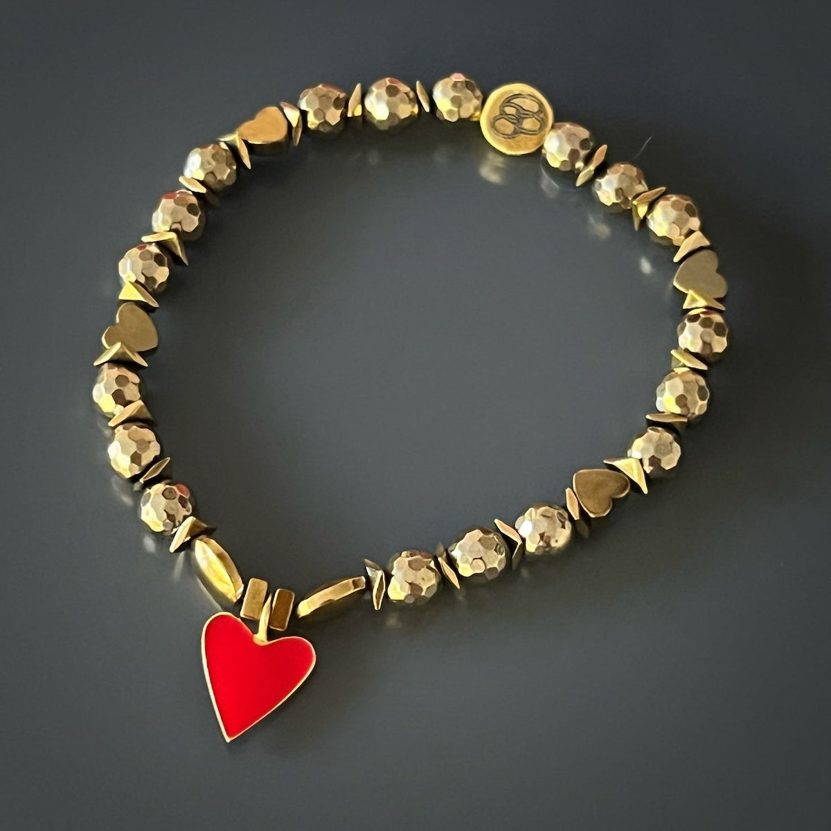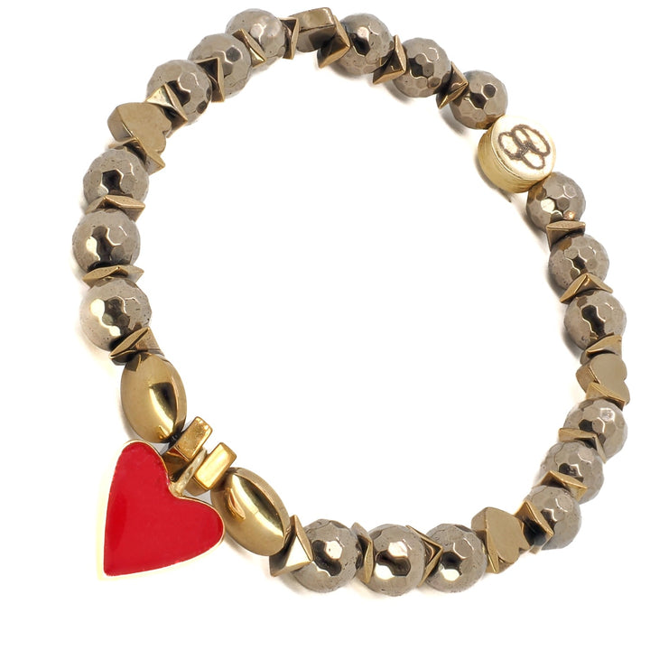 Handcrafted with 6mm gold-colored hematite stone beads and heart-shaped hematite accents. Features sterling silver gold-plated heart charm with red enamel and logo bead. Bracelet length: 6.5".