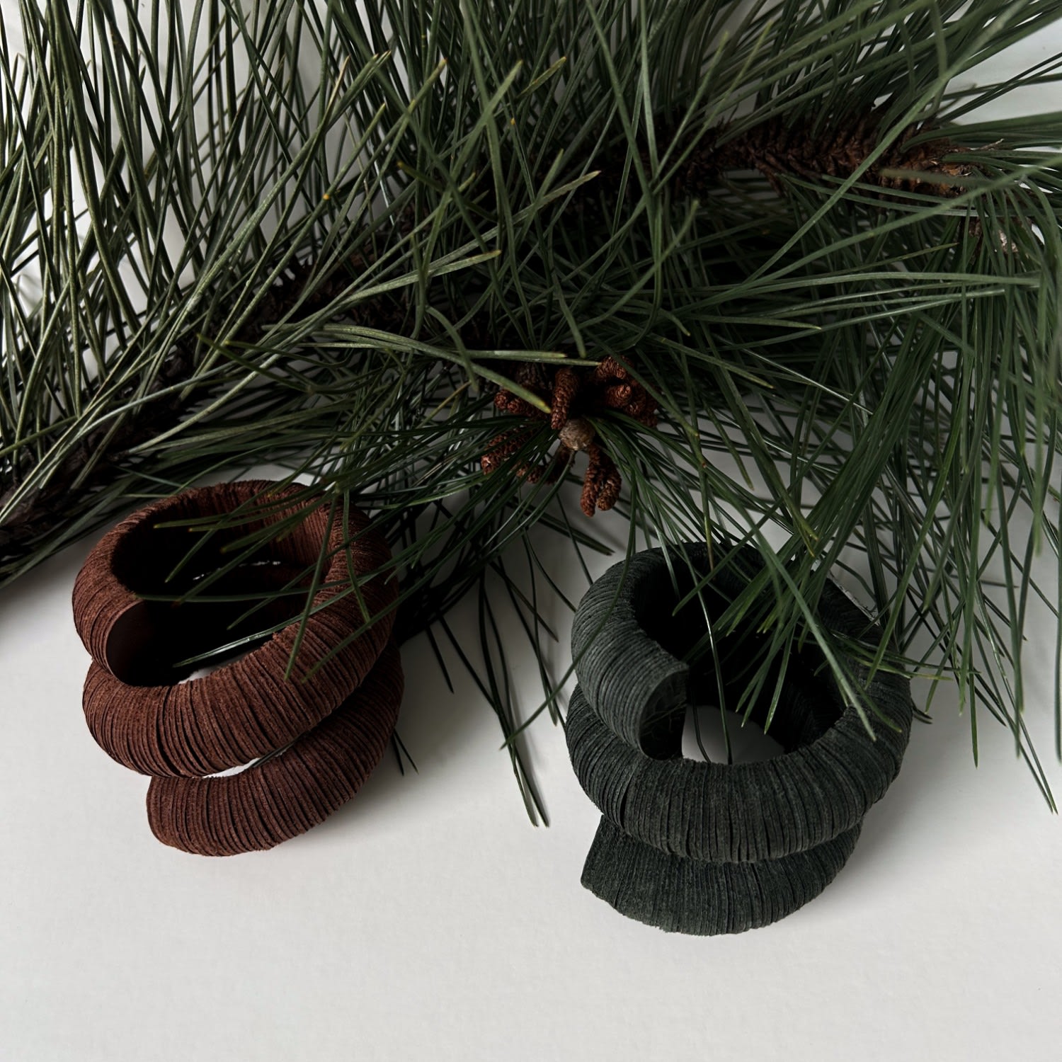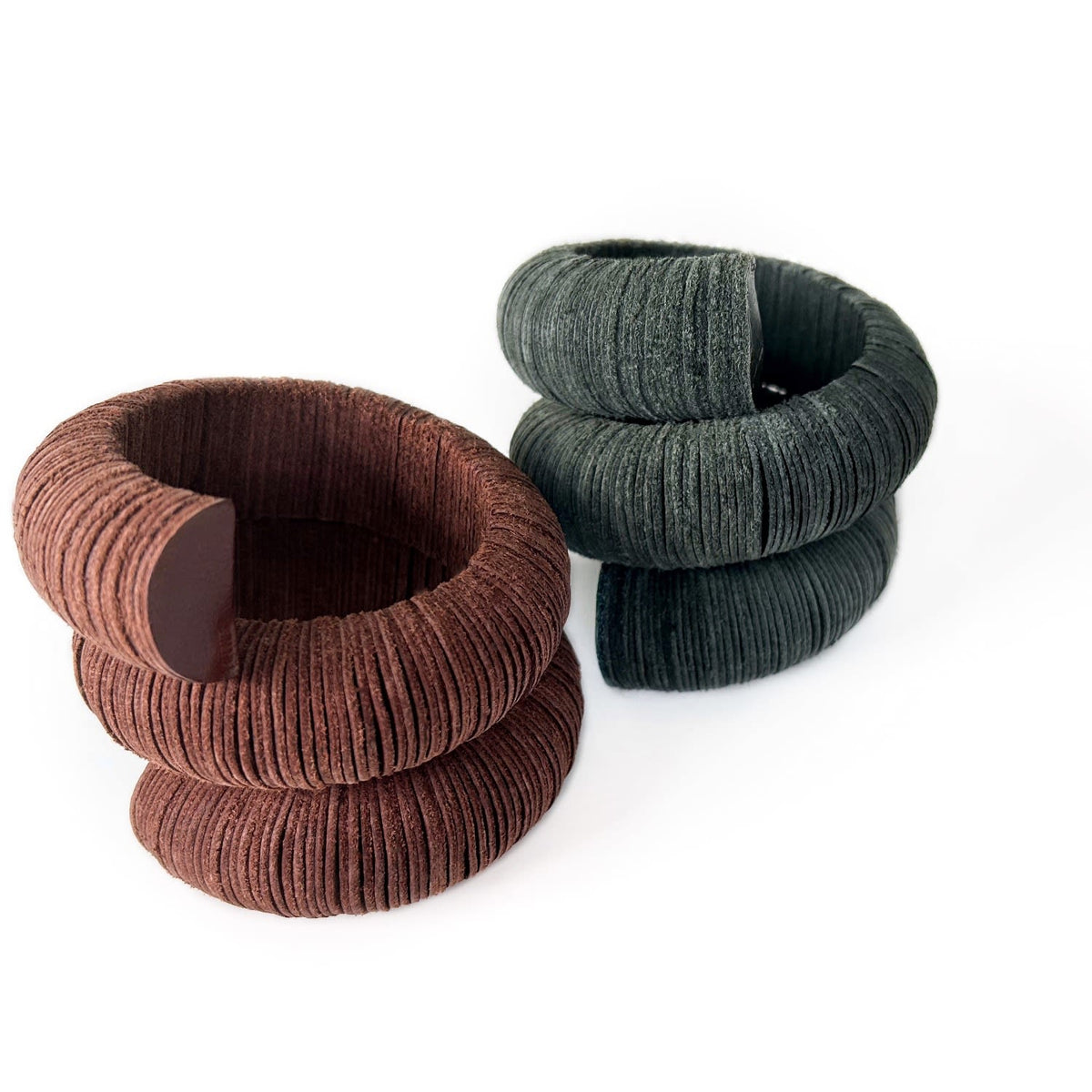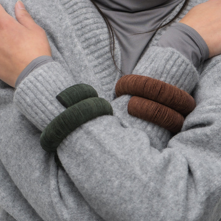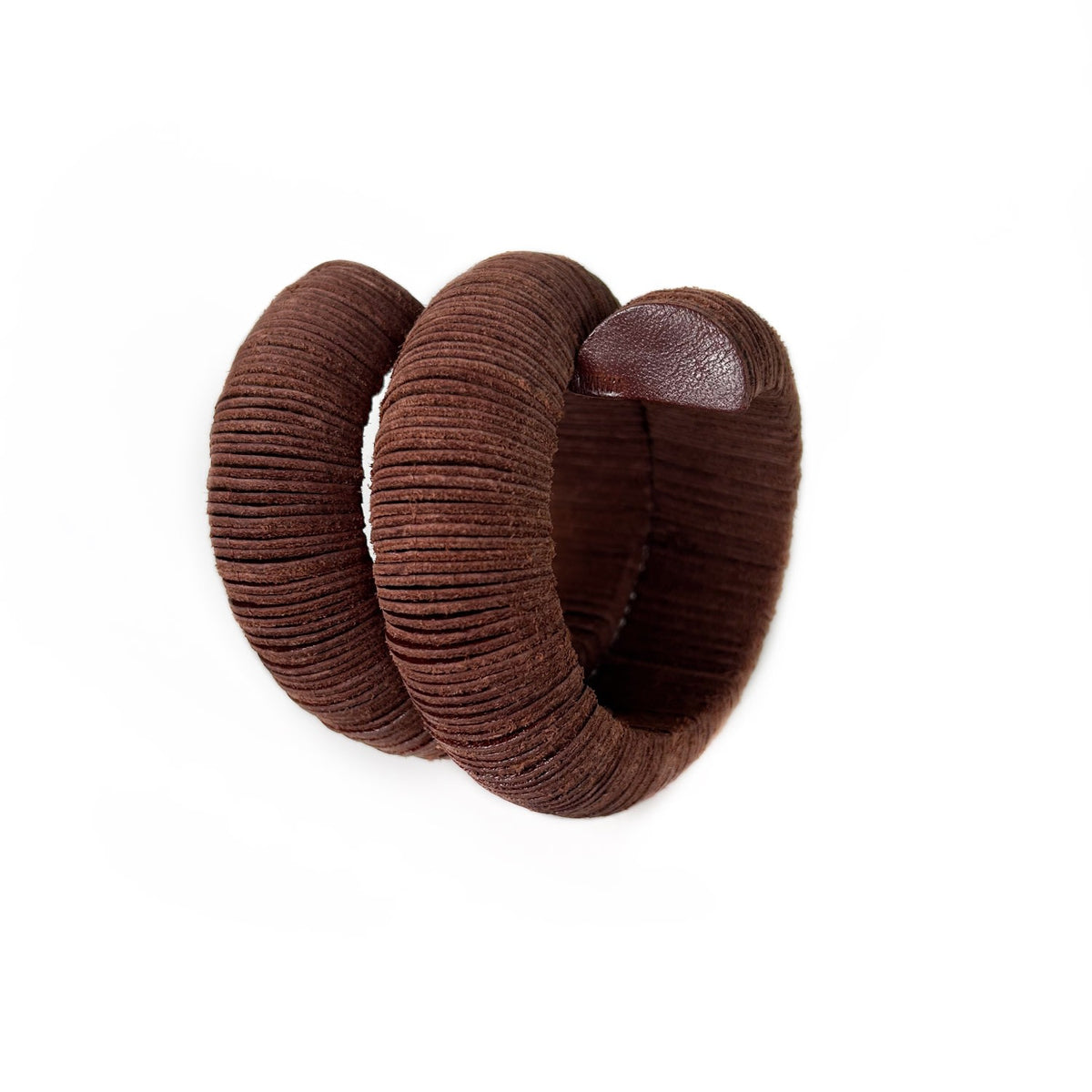 This bracelet is handcrafted from upcycled leather with a rich brown suede texture. Each piece is hand-punched and strung onto memory wire.