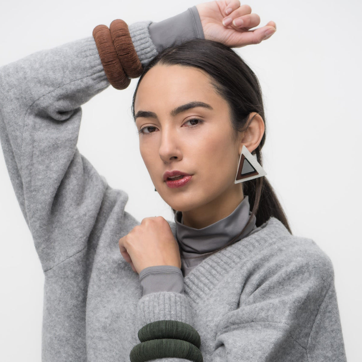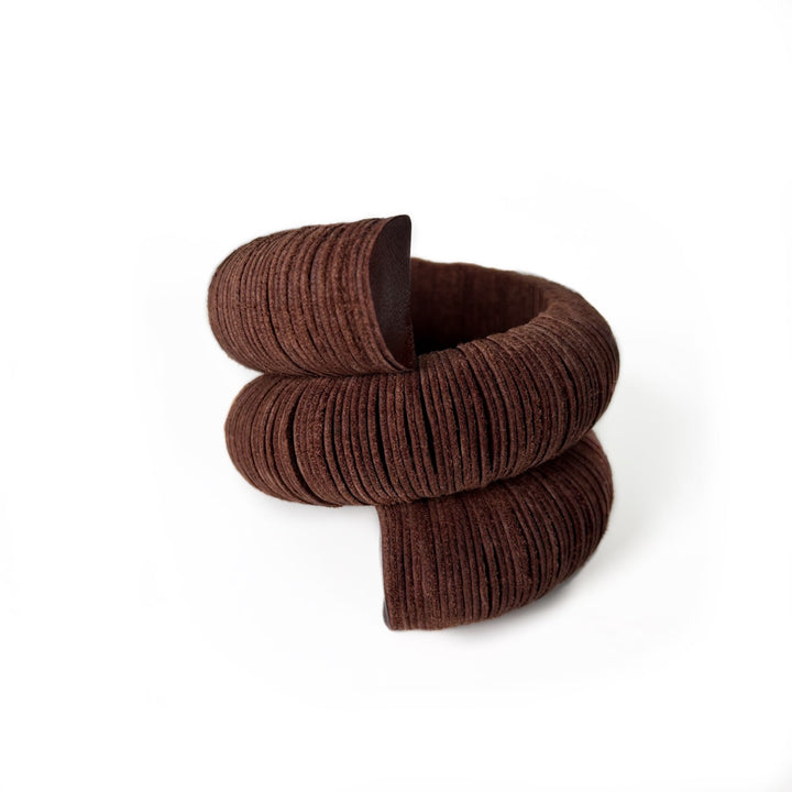 This Flow Cuff Leather Bracelet Brown by Waiwai is a sculptural masterpiece. Handcrafted from upcycled leather, this bracelet redefines elegance with its bold coiled design. The rich brown suede texture and organic flow create a statement piece that is both striking and sustainable. Each tiny piece of leather is meticulously hand-punched and strung onto memory wire, showcasing artistry and true craftsmanship. It is a celebration of timeless craftsmanship and individuality.