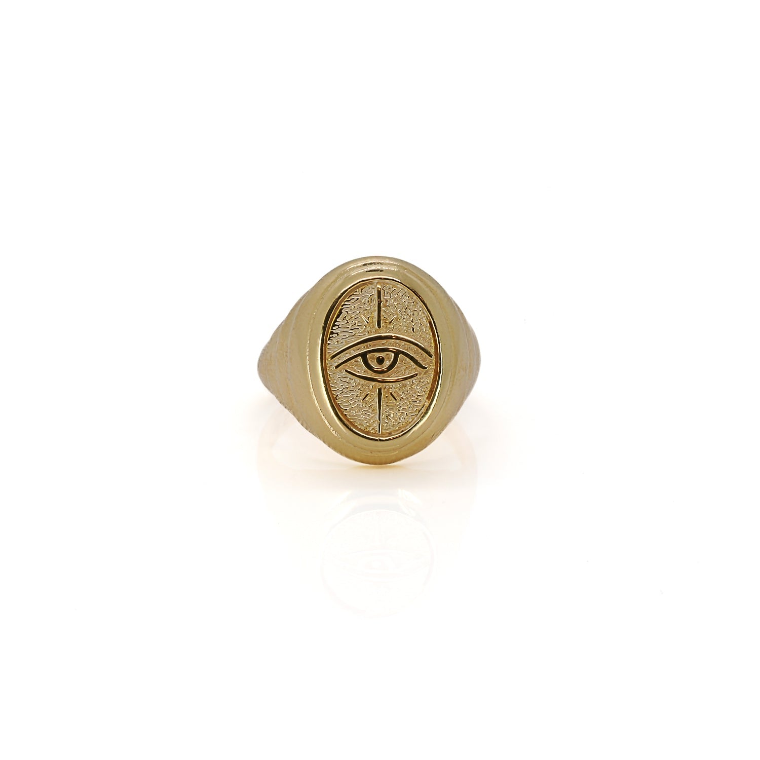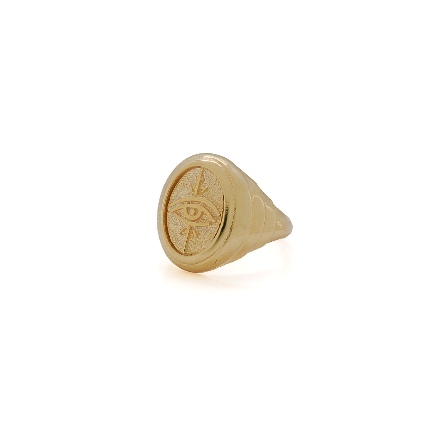 This adjustable signet ring is crafted from sterling silver with 18K gold plating and features an etched evil eye symbol.