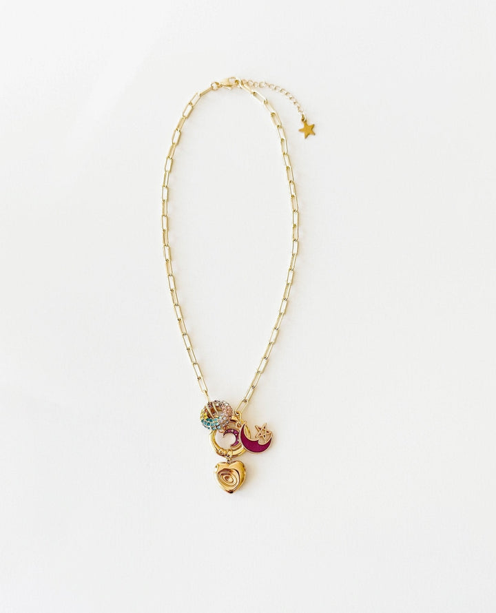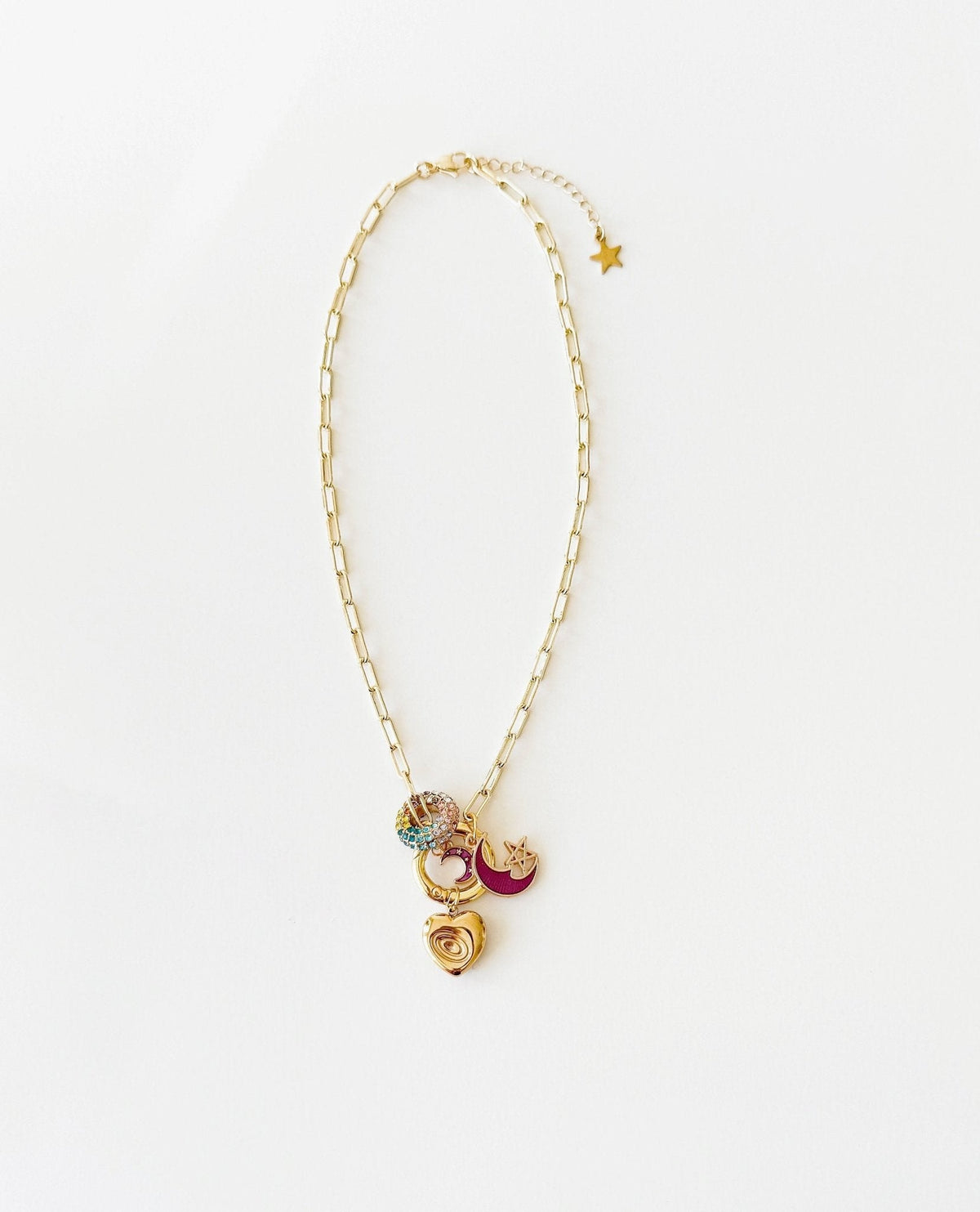 This Ethereal Heart Necklace by Vicky&Nico is a celestial-inspired statement piece designed for dreamers. The gold paperclip chain is adorned with cosmic charms: a radiant purple crescent moon with a star, a shimmering rainbow pavé circle, and a bold gold heart. This necklace blends mysticism and elegance, making it the perfect piece to elevate any outfit. Whether worn alone or layered, it guides your style to the stars with its magical and unique design.