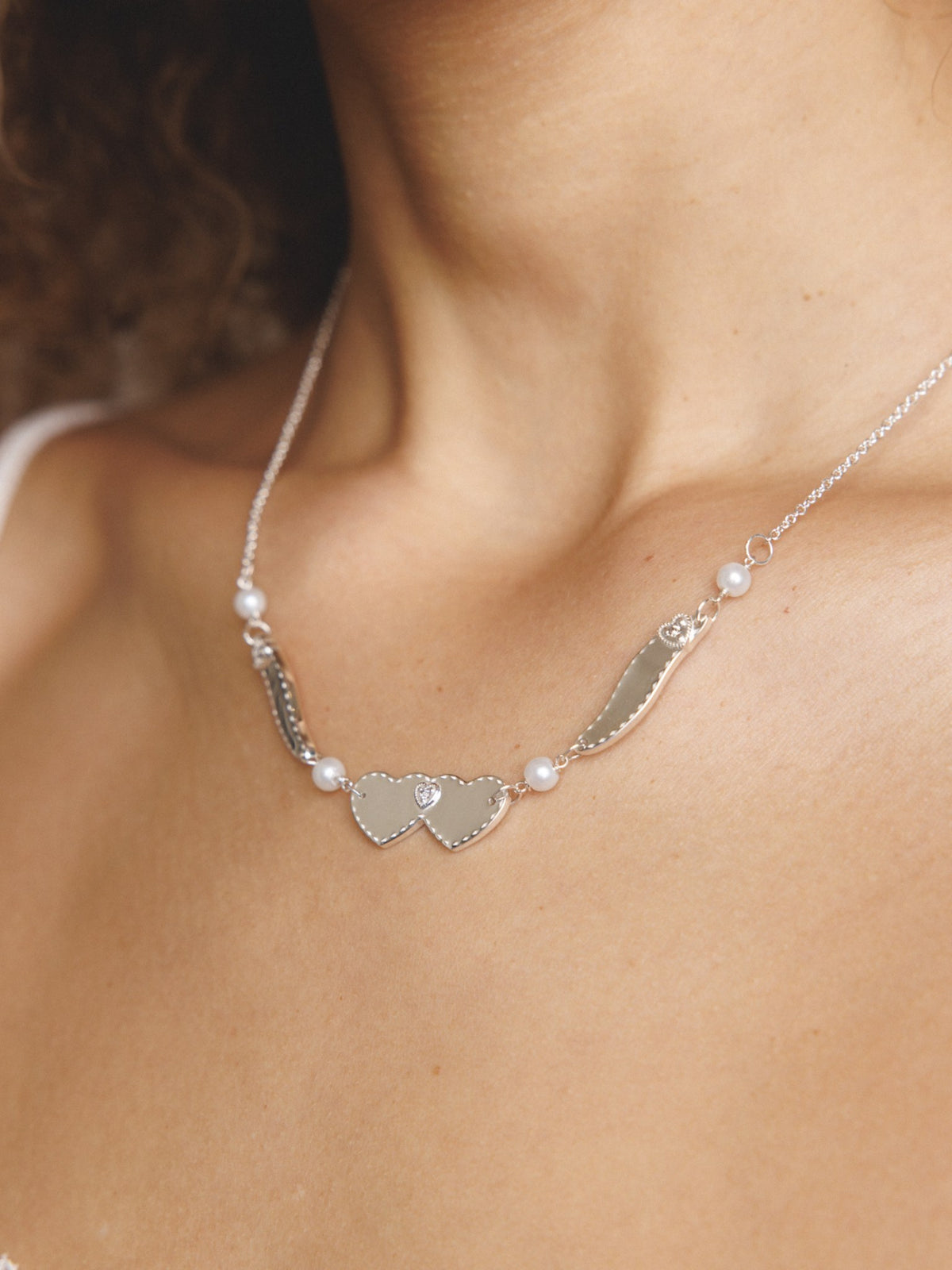 This Wings of Love Necklace by Déclarer symbolizes affection and unity with its double-heart motif. A blend of timeless elegance and romantic spirit, the design incorporates luminous glass pearls and sparkling Austrian crystals, capturing both softness and brilliance. A versatile piece that can be styled alone or paired with its matching bracelet for a bolder expression of love.