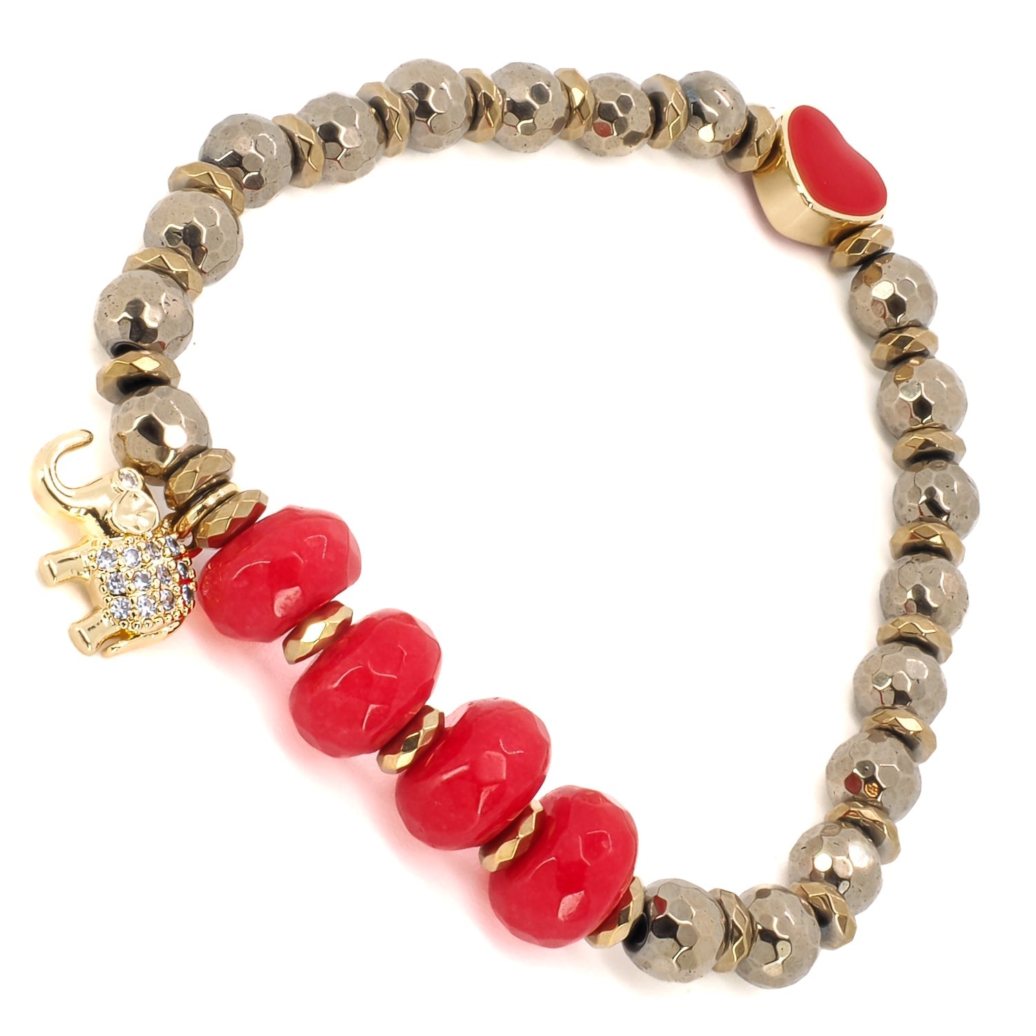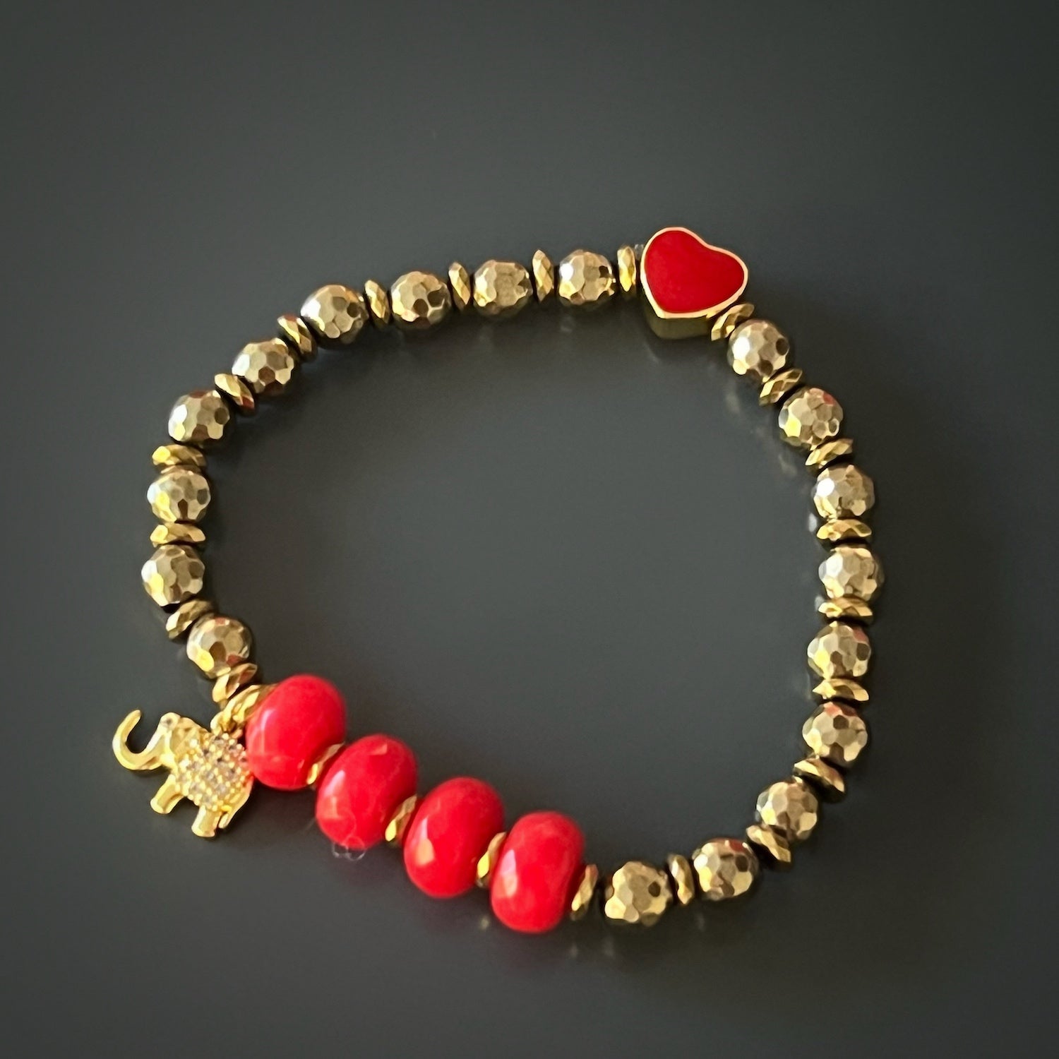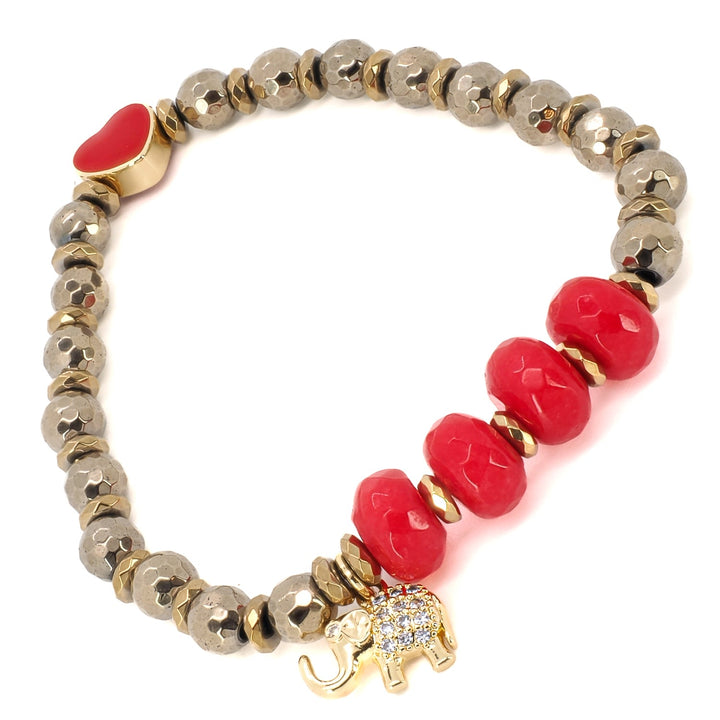 6mm gold hematite stone beads, 18k gold plated red enamel heart, 18k gold plated elephant charm with zircon, faceted coral beads. Size: 6.5".
