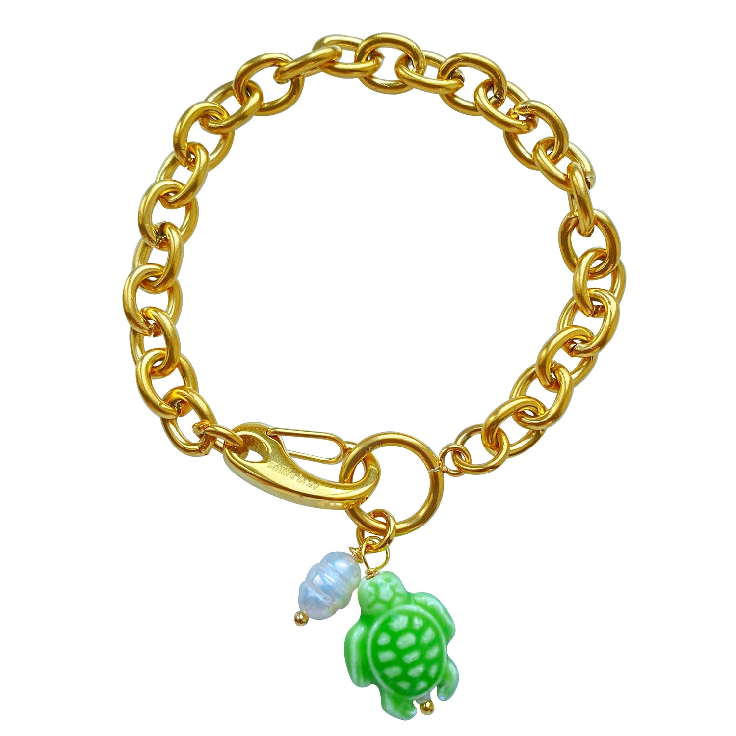 This bracelet is handmade with freshwater pearls, gold-plated stainless steel, and a ceramic turtle bead. Each piece is unique.