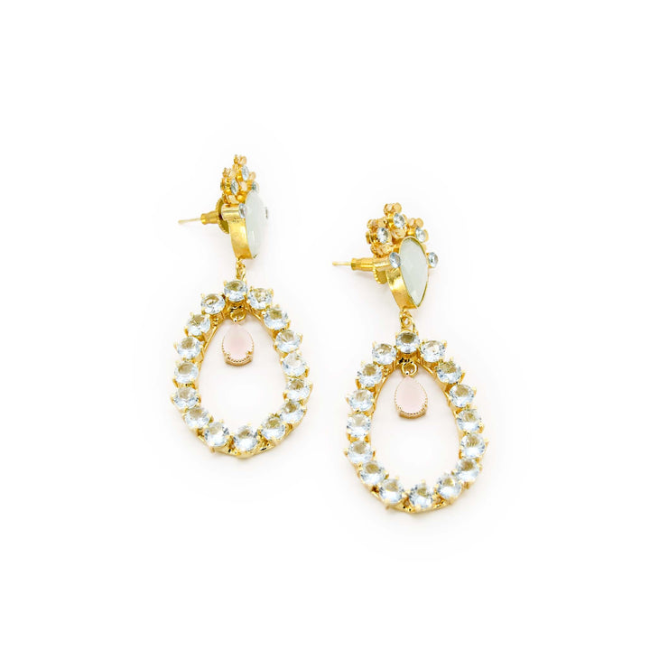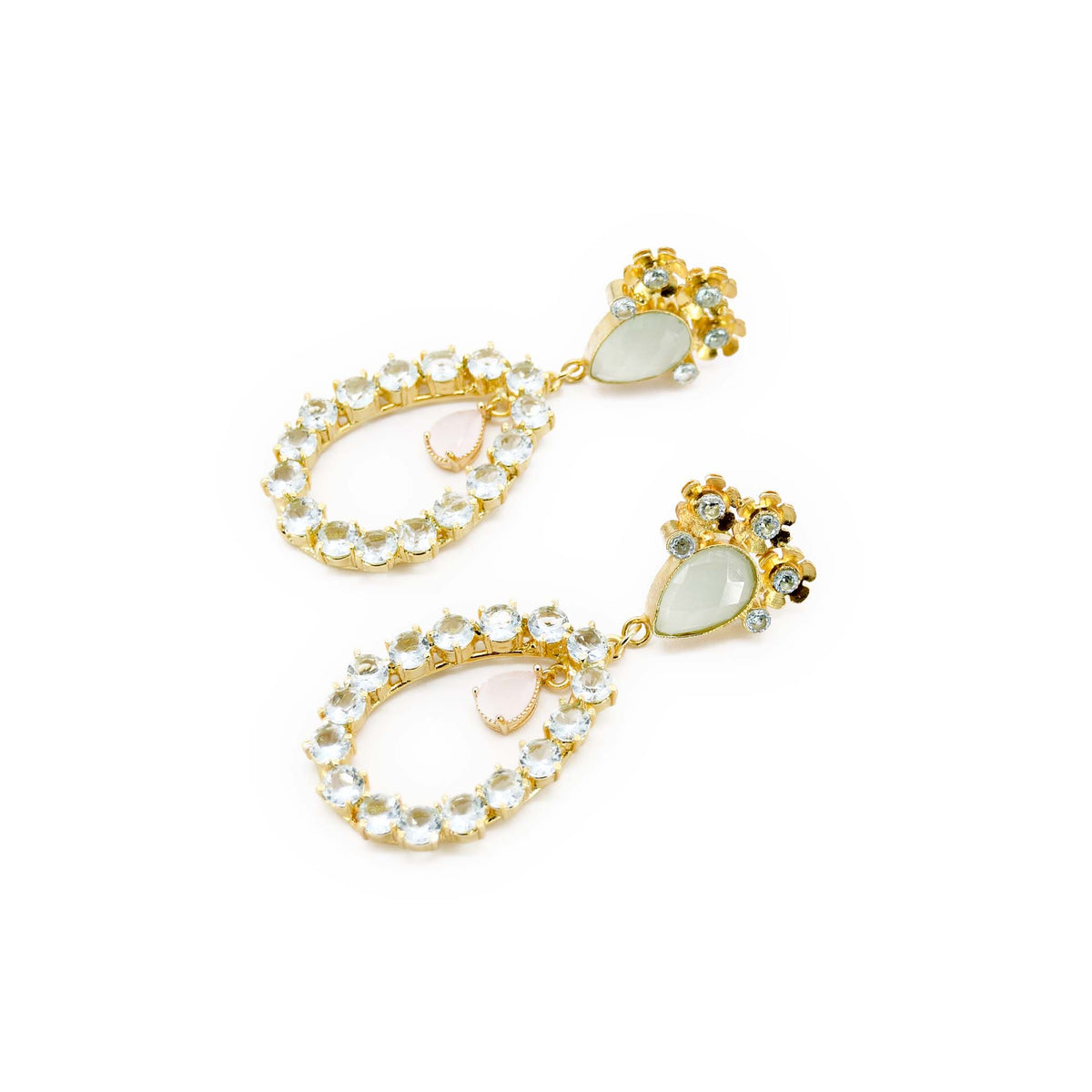 Handmade in 22k gold-plated brass with aqua blue jade and aqua quartz stones. Post back fastening. Nickel- and lead-free.