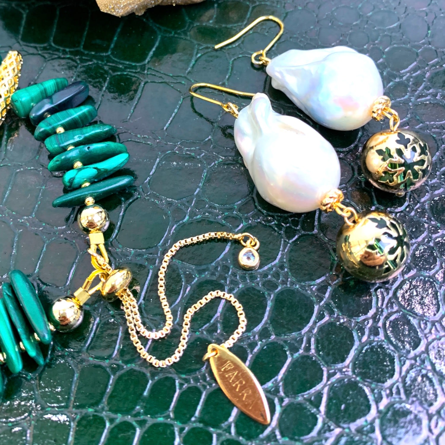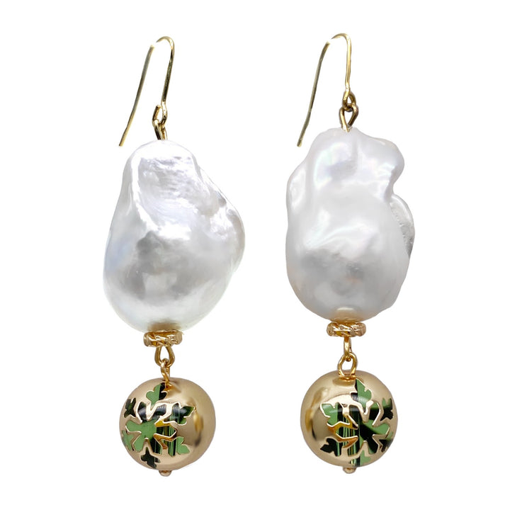 These earrings are crafted with baroque pearls and feature Japanese golden-plated brass findings with 14k gold-plated snowflake balls.