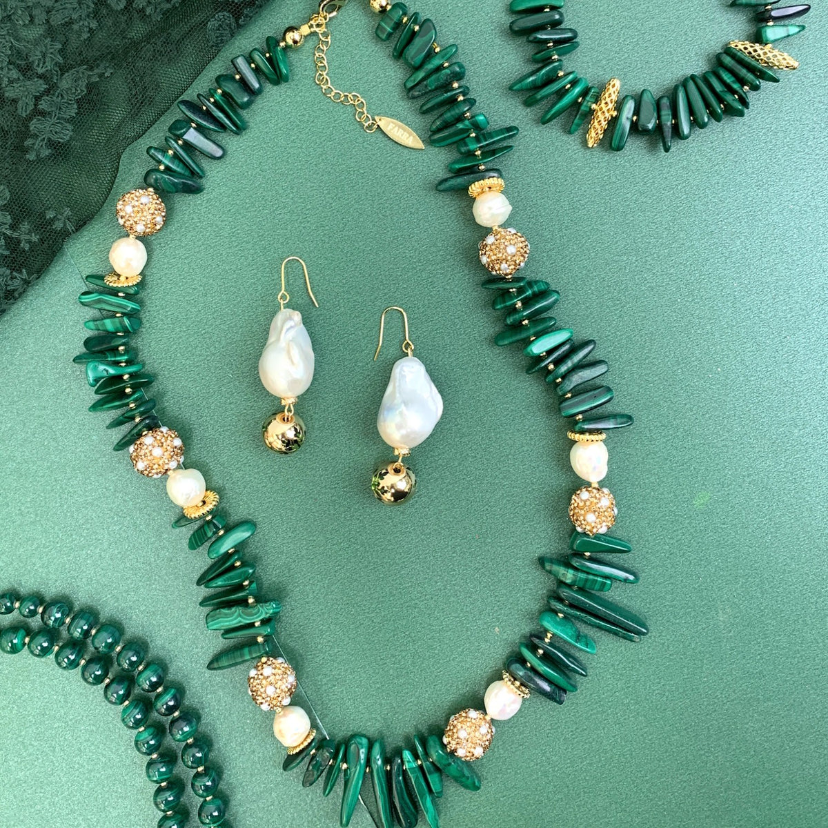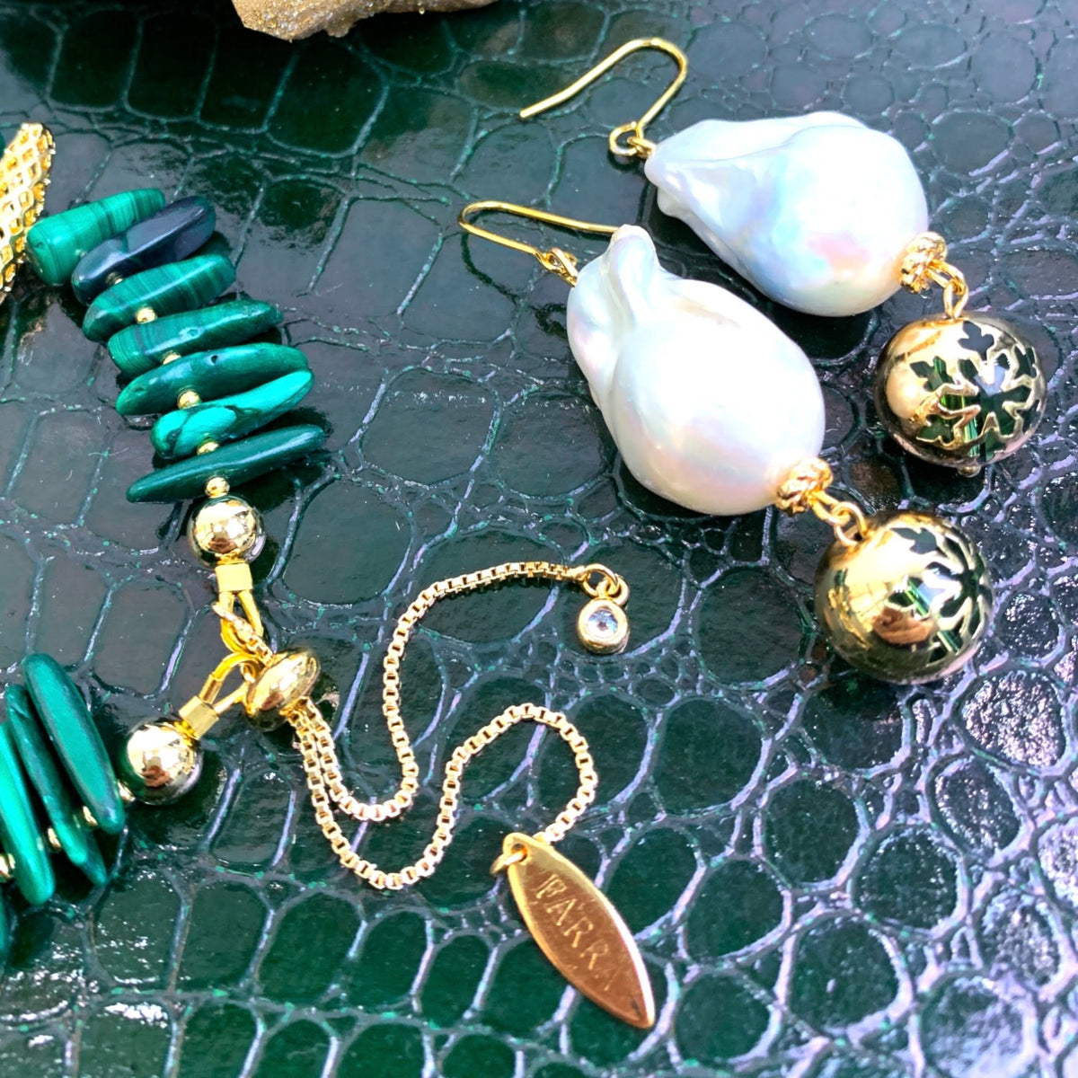 These Christmas Style Baroque Pearls With Snowflake Ball Dangle Earrings by Farra are an elegant and festive accessory. They feature irregular, organic baroque pearls that add a touch of unique elegance, while the 14k gold-plated snowflake ball dangles enhance the festive theme. These earrings are a perfect and gorgeous gift for a birthday or anniversary, ideal for special events or daily wear during the holiday season.