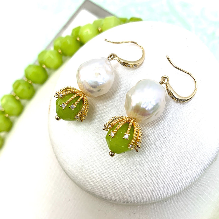 These handmade earrings are crafted with irregular freshwater pearls and grass green jade, with Japan golden plated brass findings.