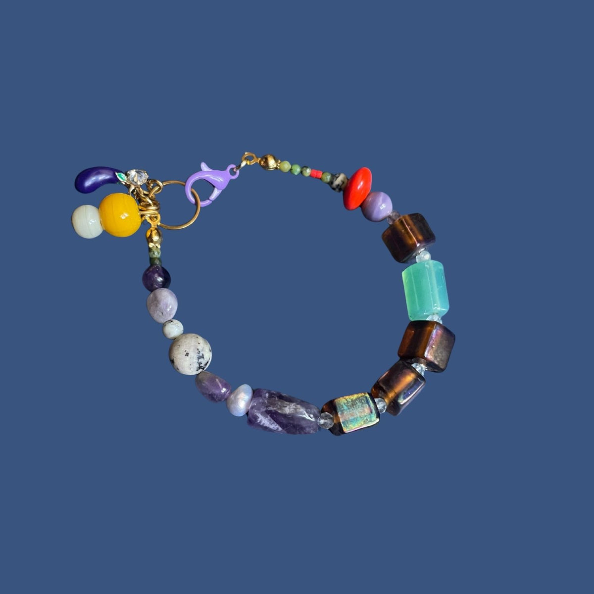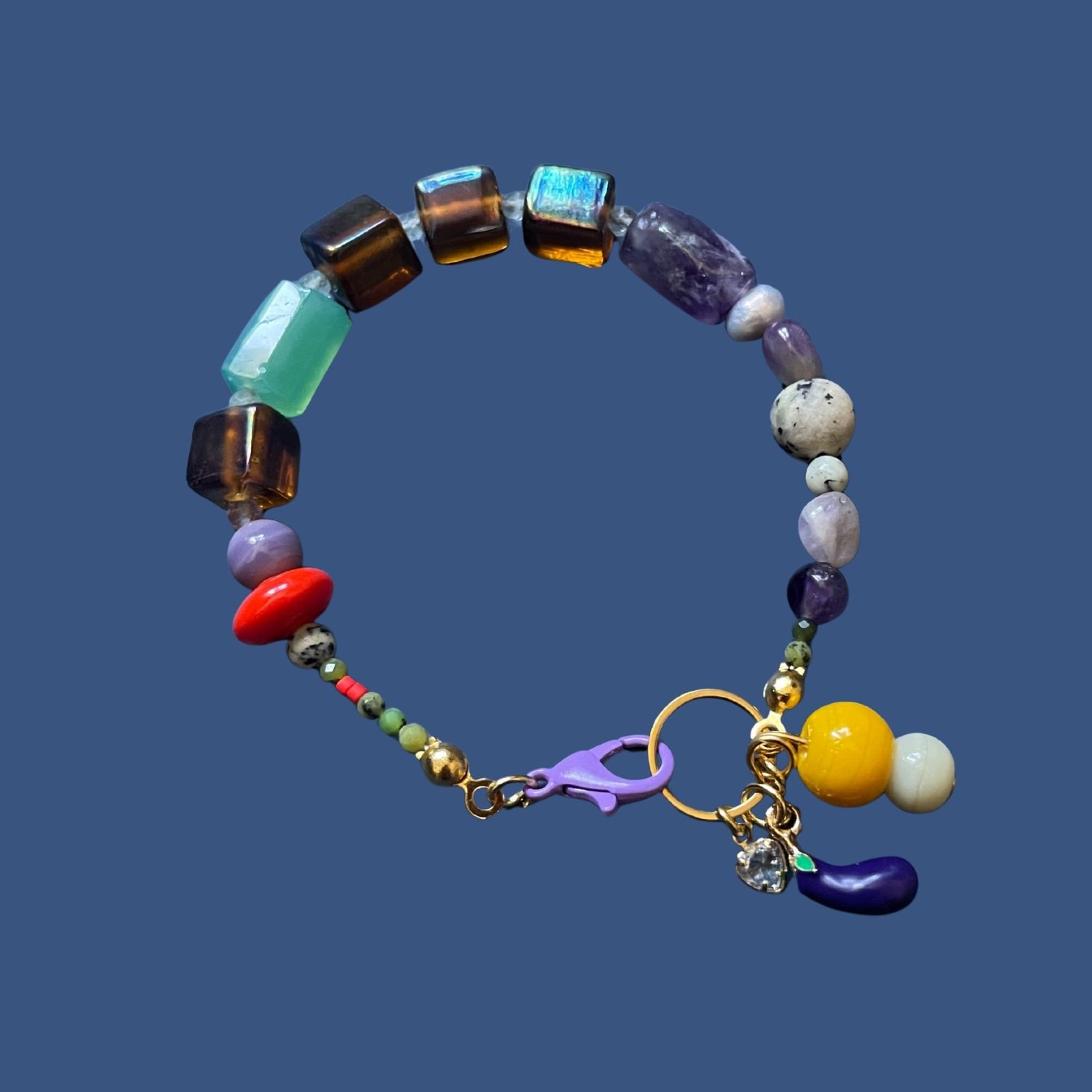 Baba Ghanoush – Handmade Eggplant Charm Bracelet With Gemstones, Glass & Pearl