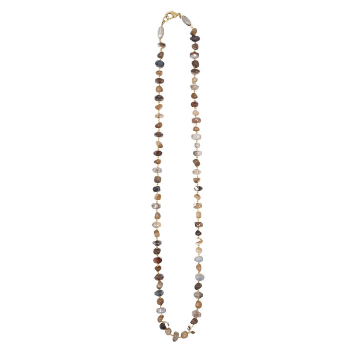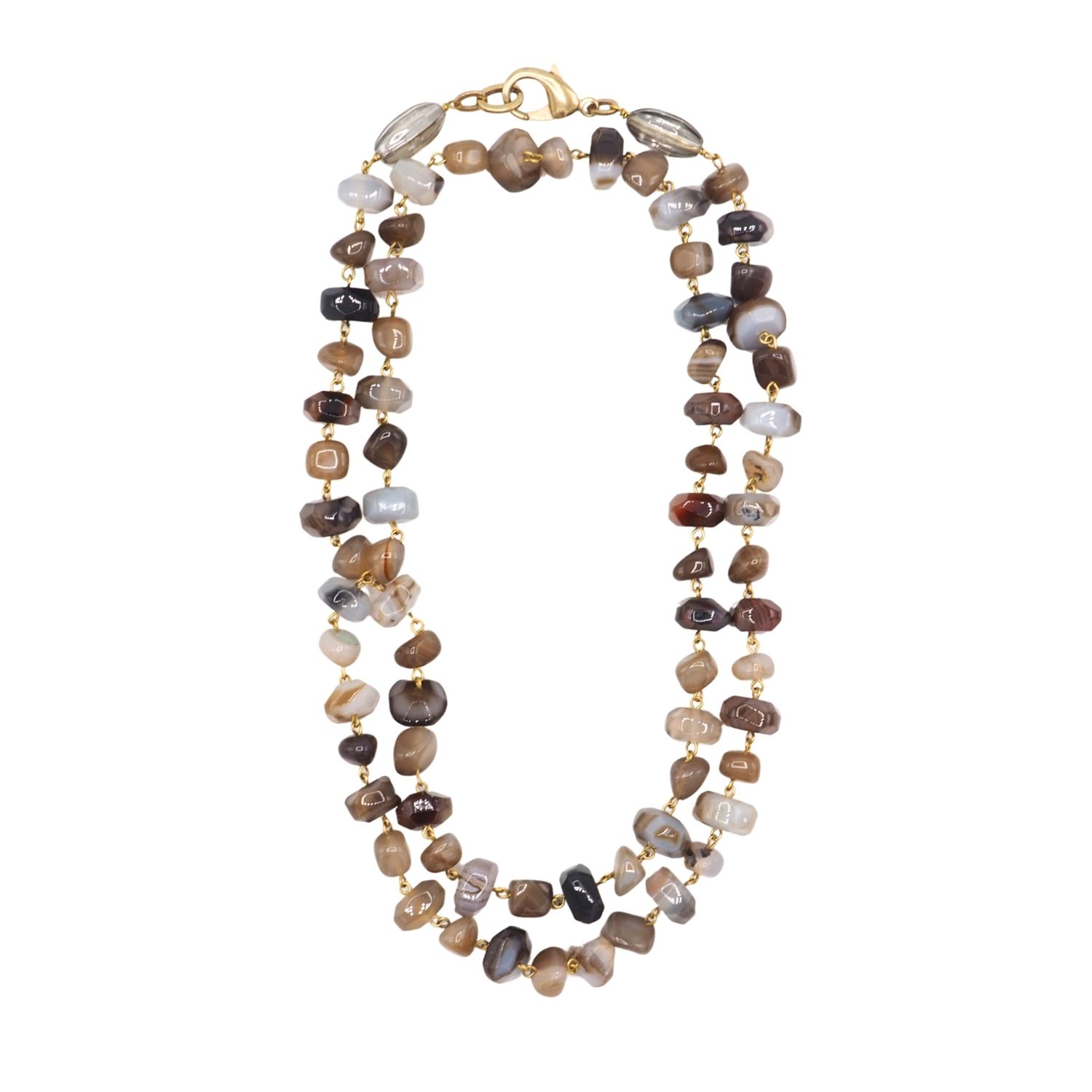 This long necklace is made with faceted natural stones and is set with brass wires. It has a length of 105cm and a weight of 220g.
