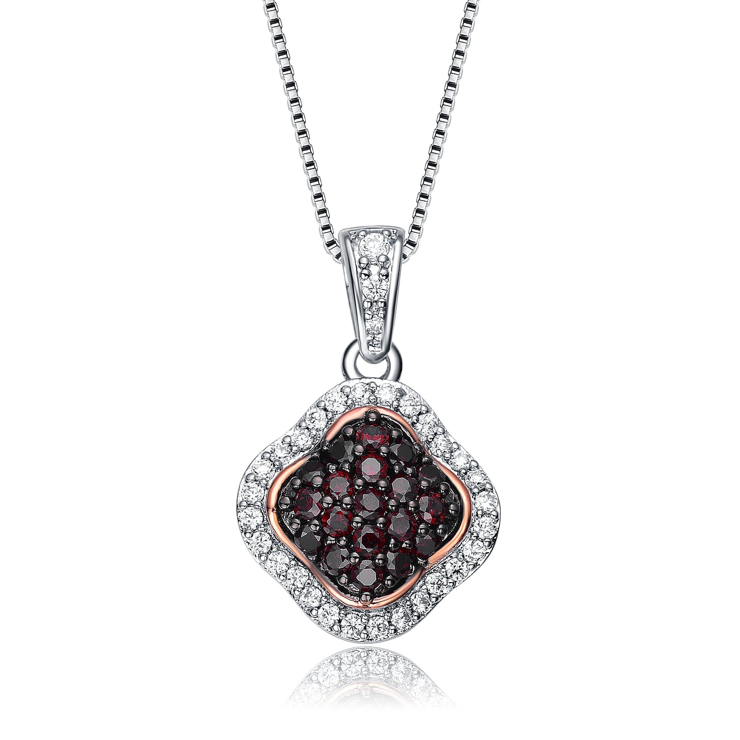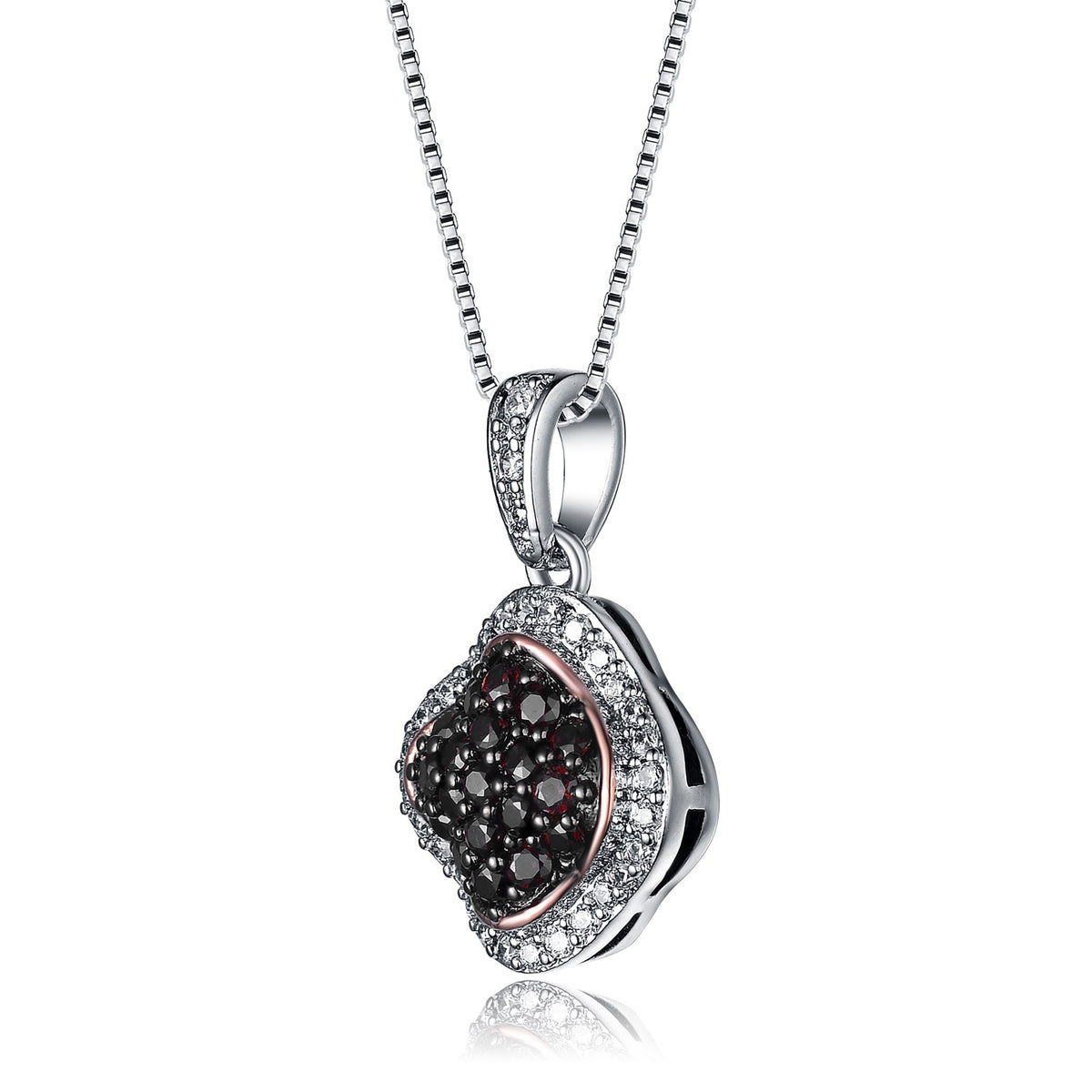 This pendant necklace is crafted from sterling silver. It features a cluster of pave dark cubic zirconia stones and is surrounded by clear cubic zirconias.