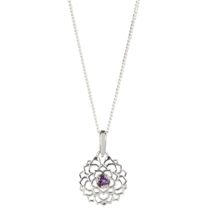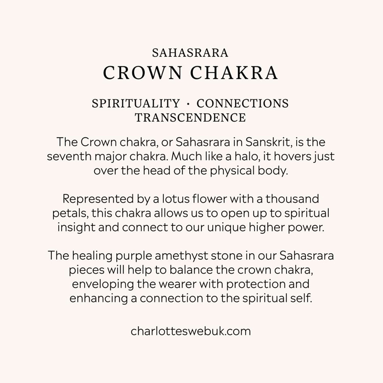 This Crown Chakra Silver Necklace with Amethyst by Charlotte’s Web Jewellery is inspired by the lotus flower, symbolizing enlightenment and connection to the universe. Designed around the Sahasrara (crown chakra), it features faceted amethyst stones that embody balance, spiritual clarity, and the February birthstone’s energy. Worn as a daily talisman, it serves as both a meaningful and striking piece of jewelry.