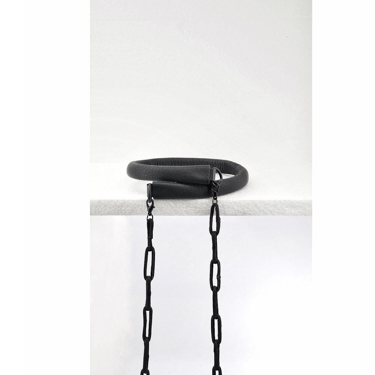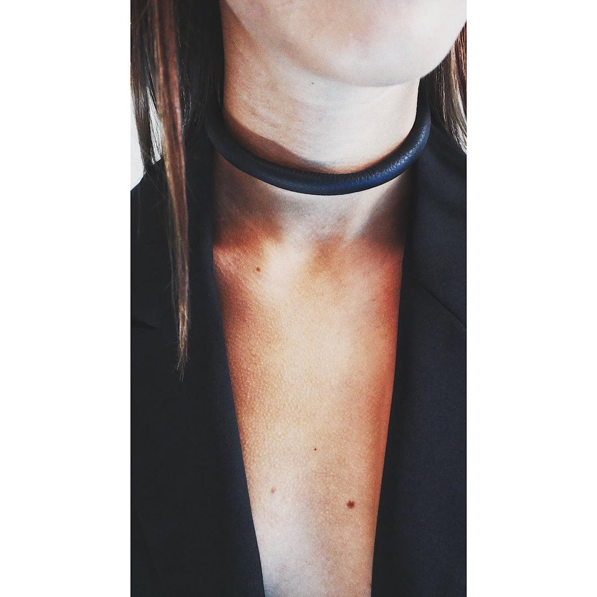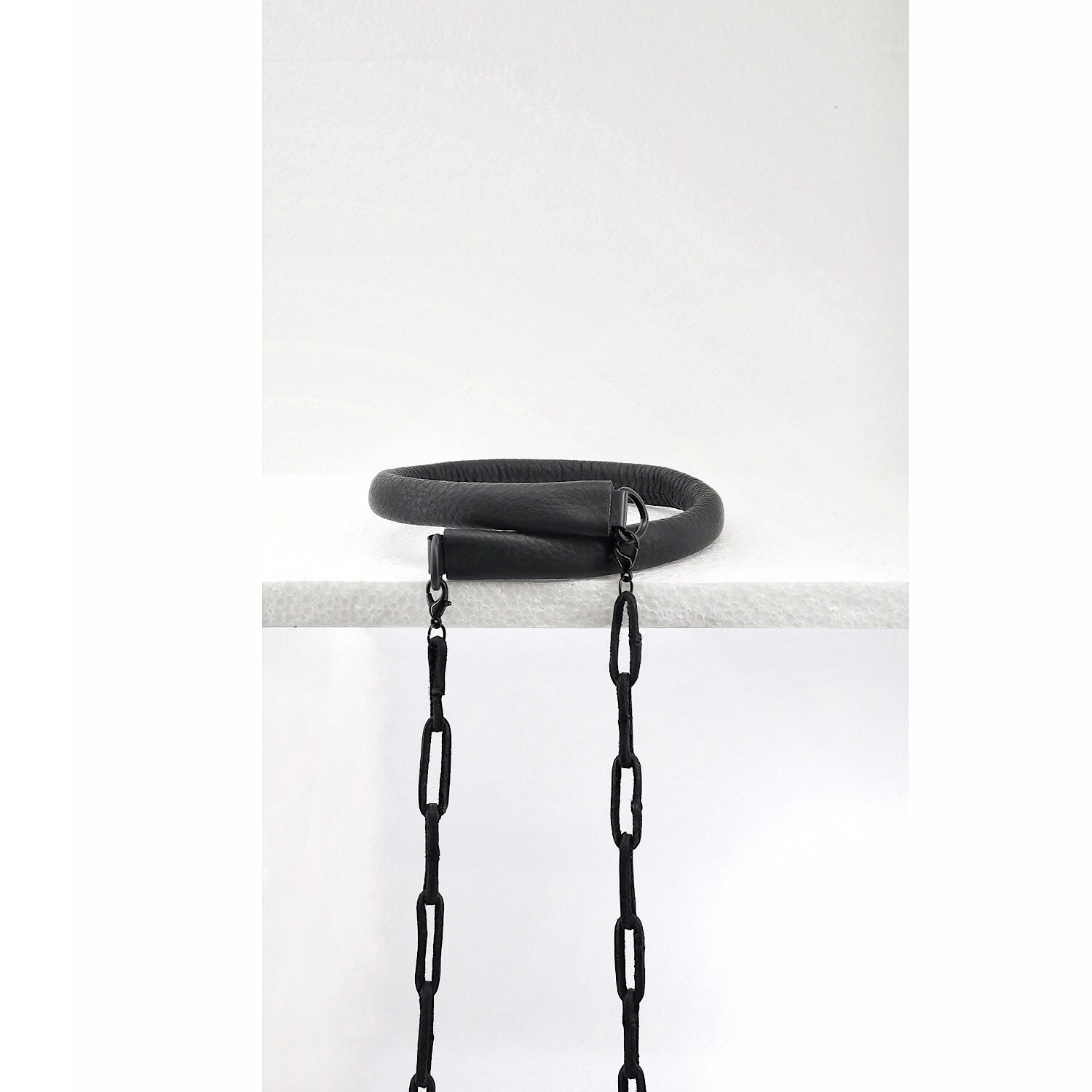 This choker is made with a hand-stitched leather chain and a stainless steel memory wire. The clasps on both ends of the chain are detachable.