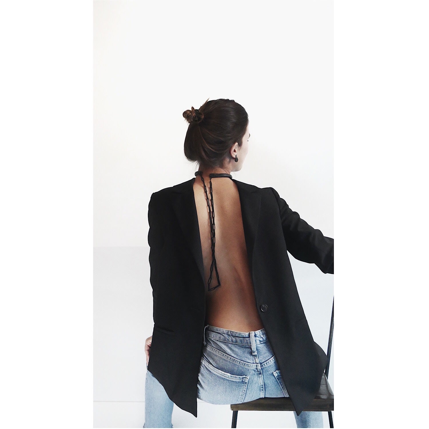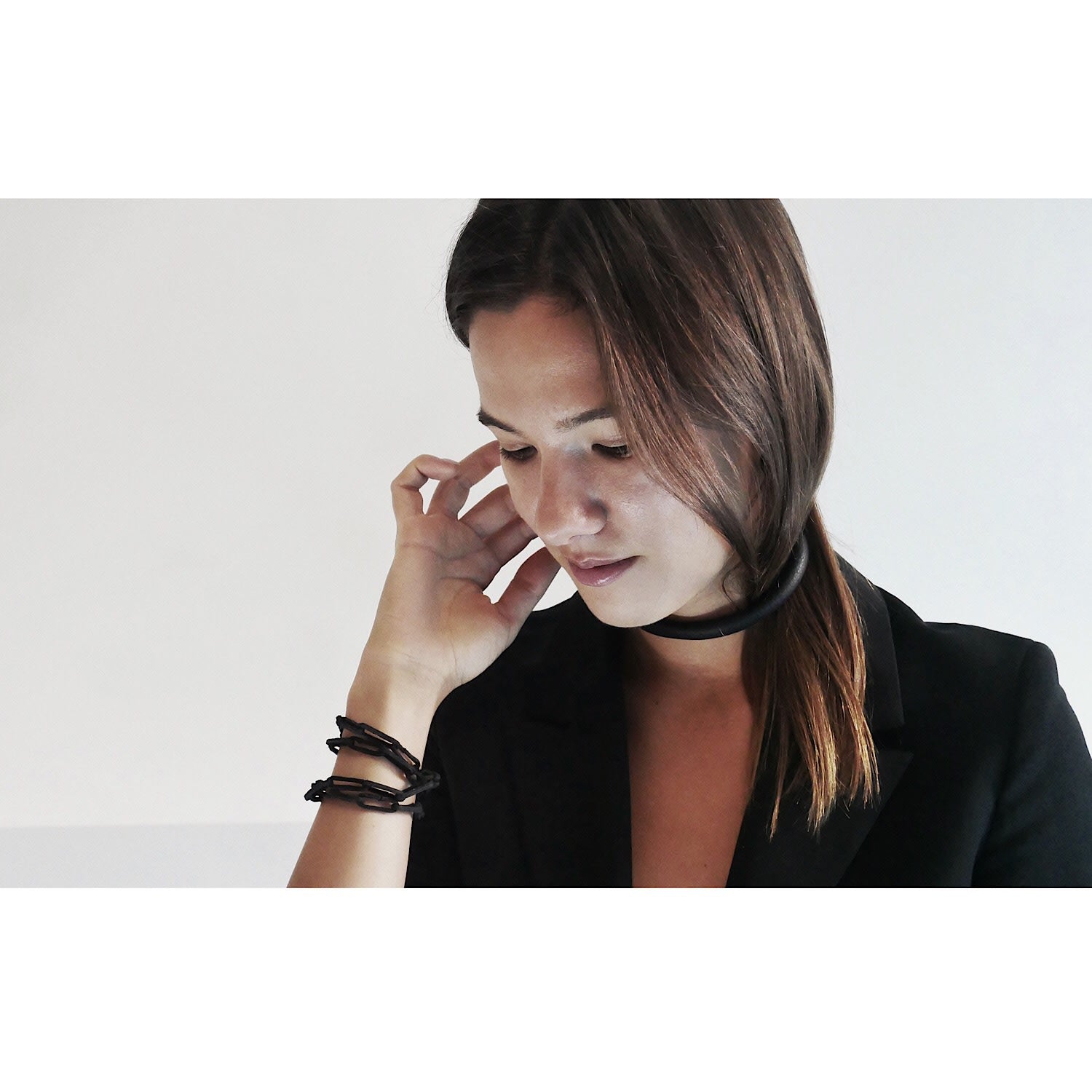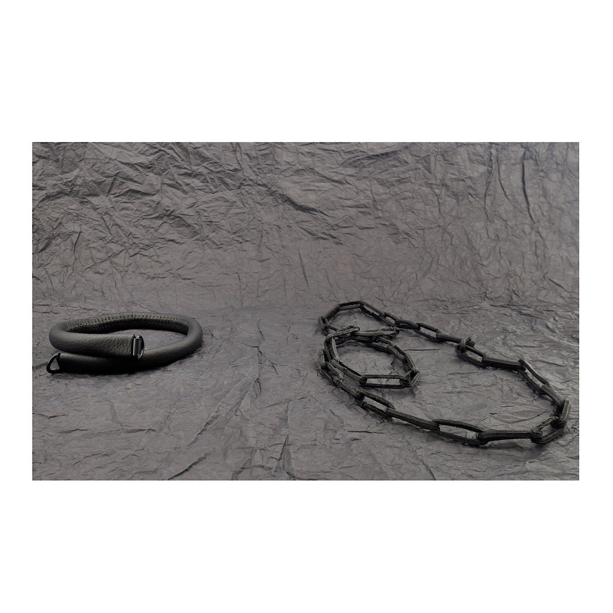 This choker is made with a hand-stitched leather chain and a stainless steel memory wire. The clasps on both ends of the chain are detachable.