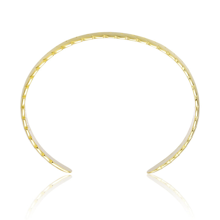This cuff bracelet is crafted with 14k gold plating and is composed of small leaf-like elements. It is 6 inches in circumference.