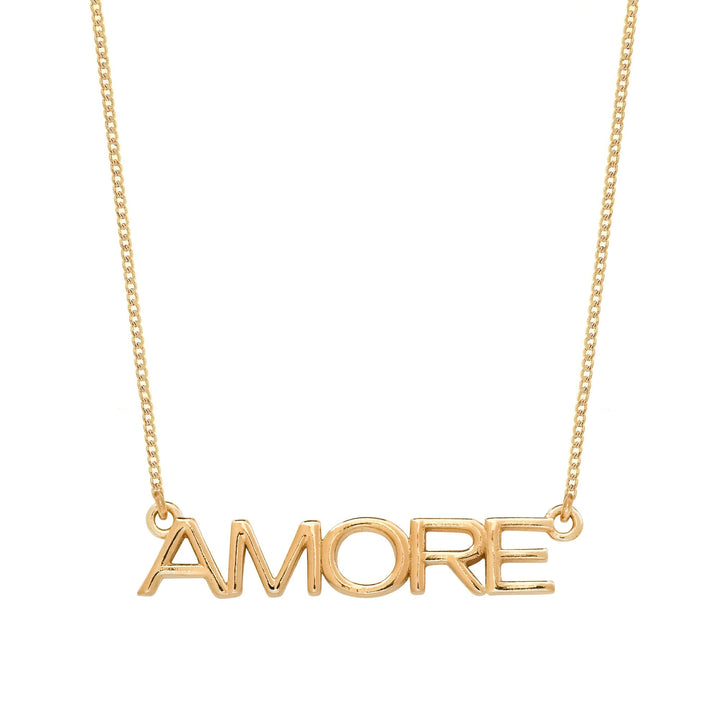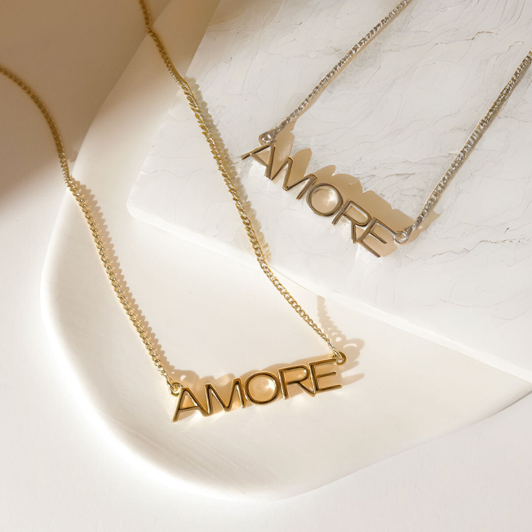 The Amore Gold Necklace by Charlotte's Web Jewellery is a glowing tribute to love. The necklace features the Italian word "Amore," a symbol of deep affection. It is a heartfelt and elegant accessory. It is a handmade piece that requires regular cleaning and care to keep its shine.