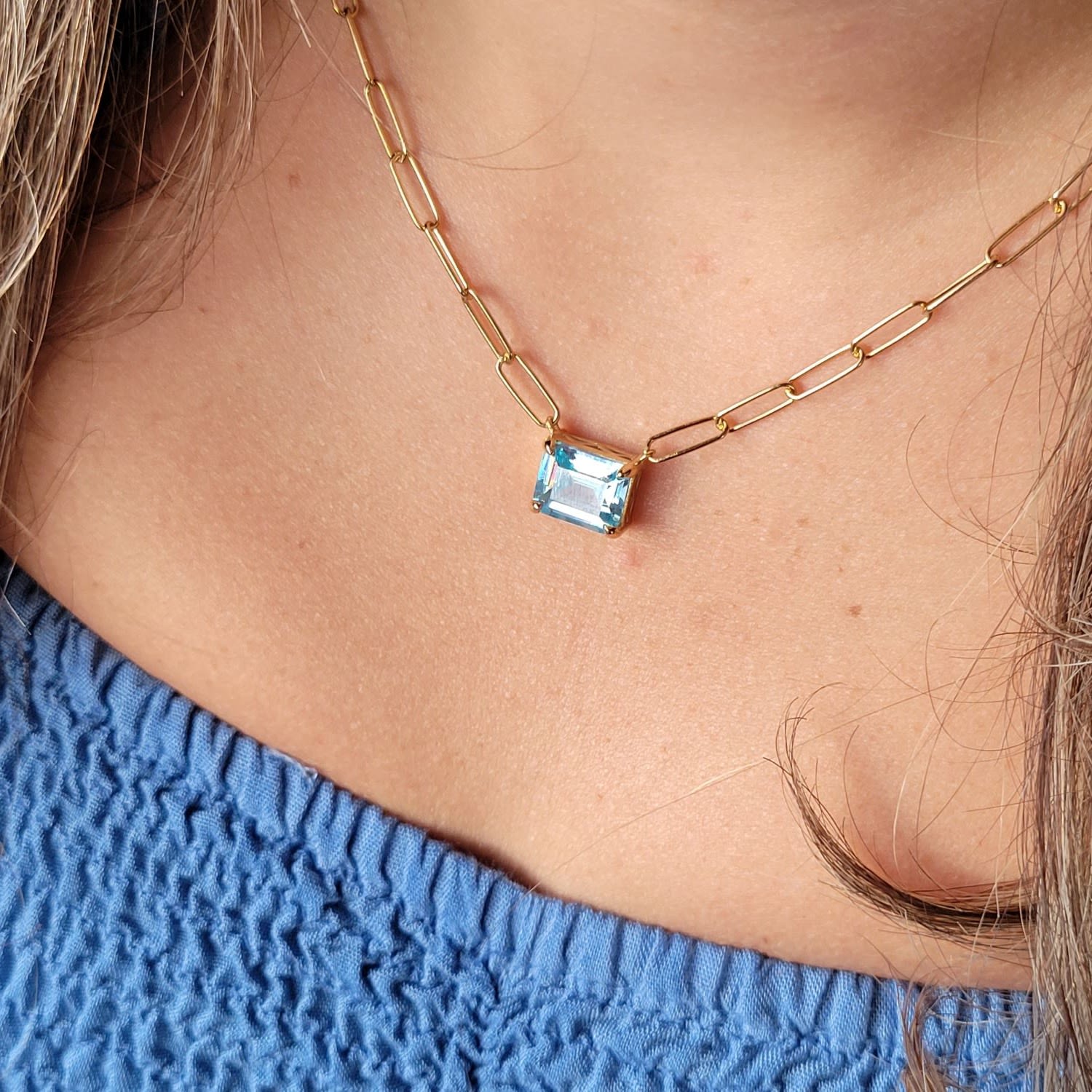 This necklace is made with a paperclip chain and features a cubic zirconia blue topaz-colored stone pendant. It is crafted from 14k gold-plated sterling silver 925 with an anti-tarnishing coating.