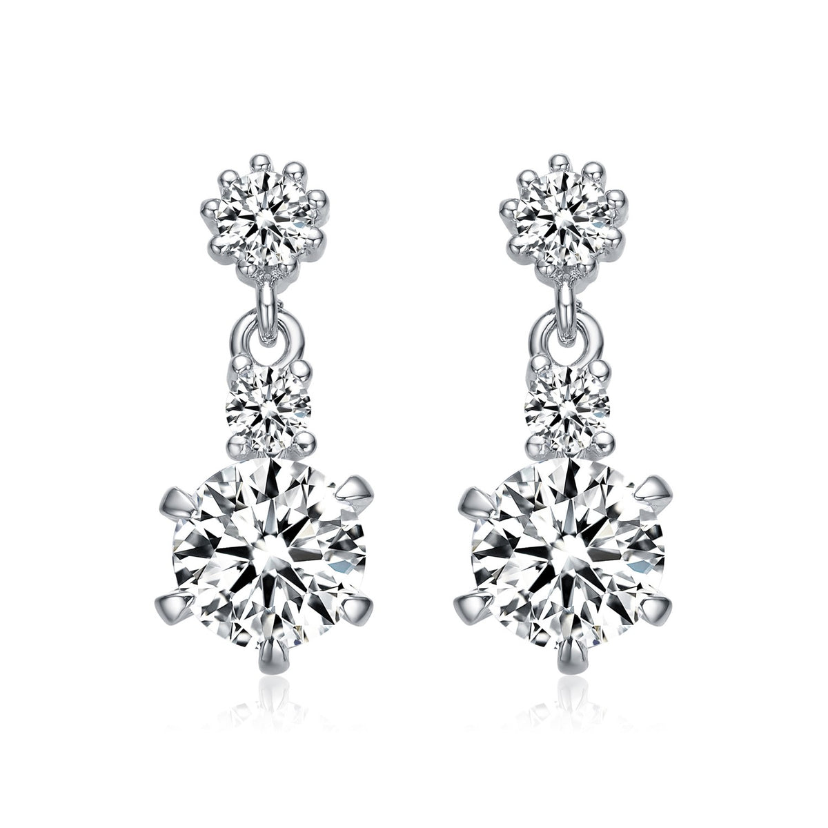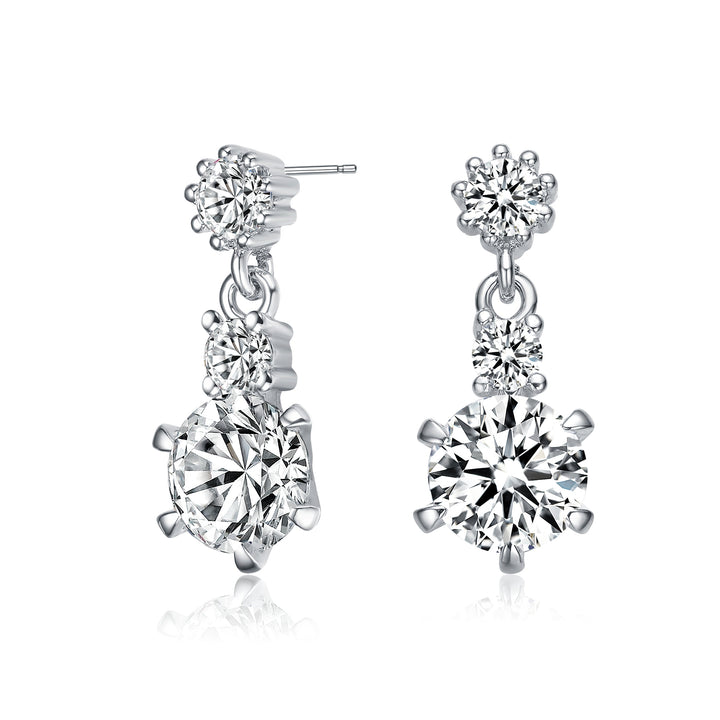 These drop earrings are made of sterling silver with rhodium plating and feature three clear round cubic zirconia stones. They are secured with a butterfly clasp.