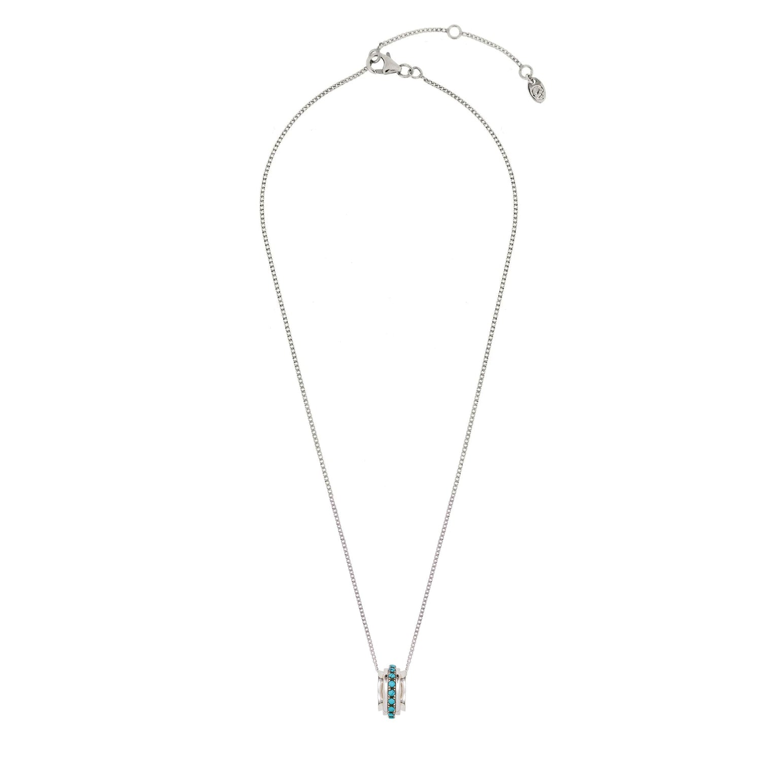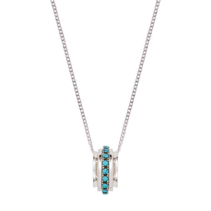 This handmade necklace is crafted from sterling silver and features a spinning pendant with a natural turquoise gemstone. It is hypoallergenic and nickel-free.