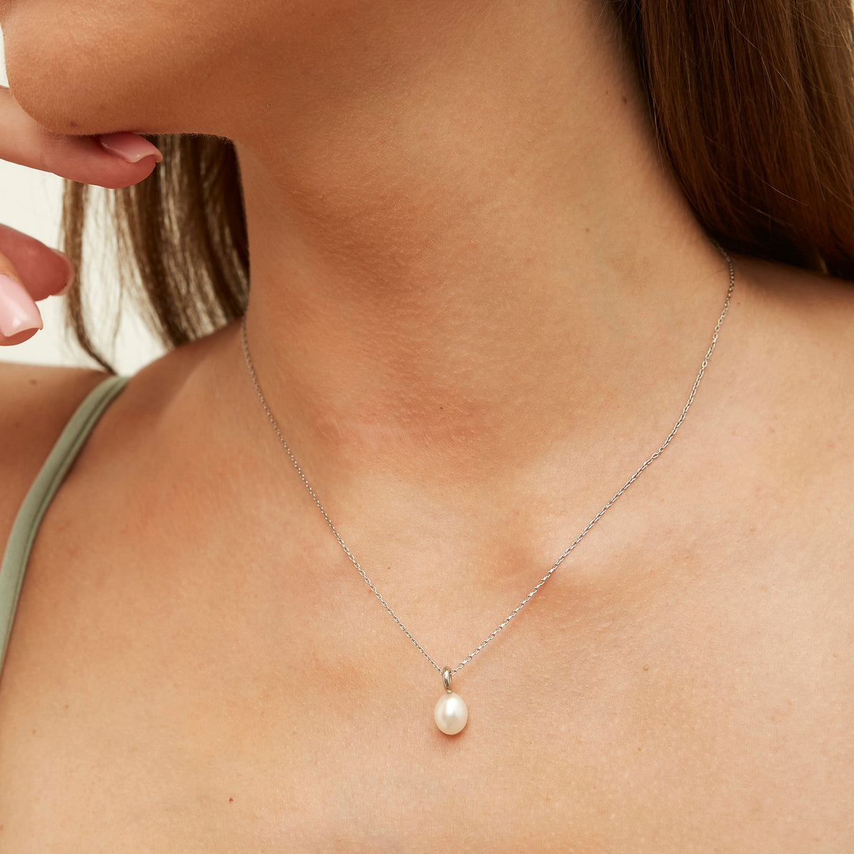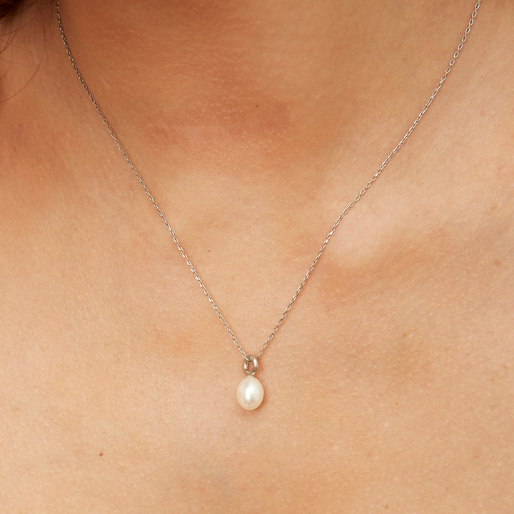 This necklace is crafted from 925 recycled sterling silver and features a white, oval-shaped freshwater baroque pearl. The chain is a dainty beaded chain with a lobster claw clasp.