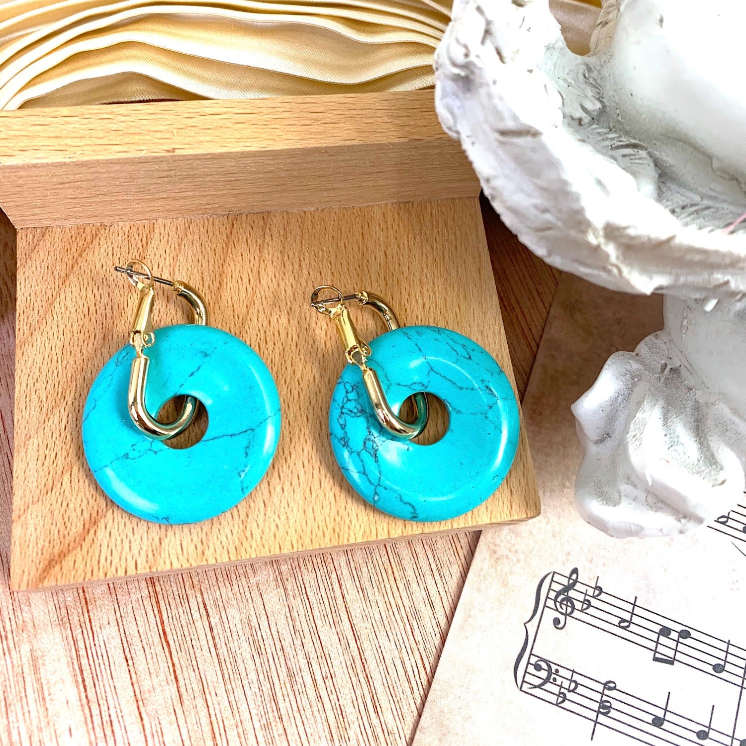These Round Turquoise Simple Clip On Earrings by Farra are a simple yet sophisticated accessory. The round turquoise stones are set with golden-plated brass findings, creating a beautiful look that can be worn from day to night. They are a versatile piece that looks gorgeous with a variety of outfits.