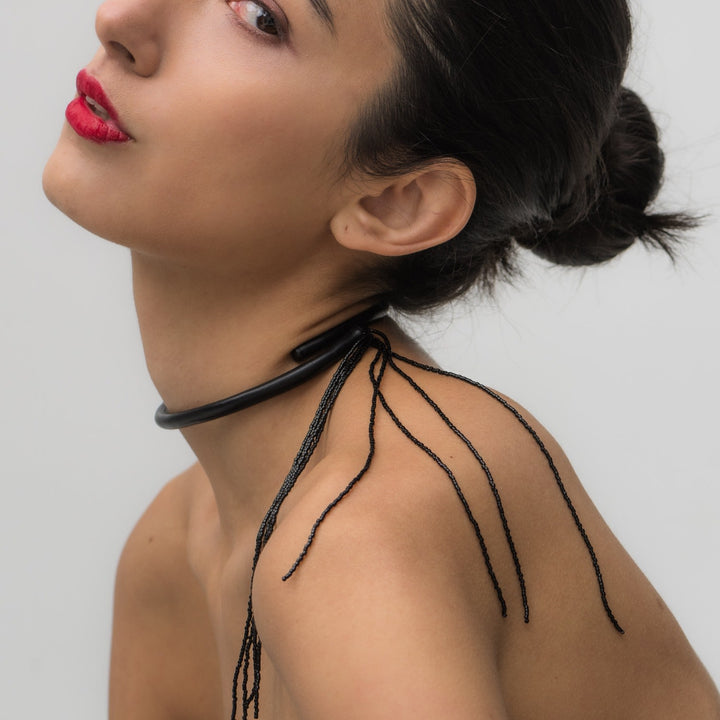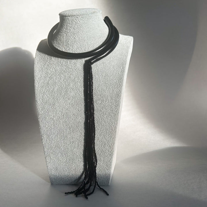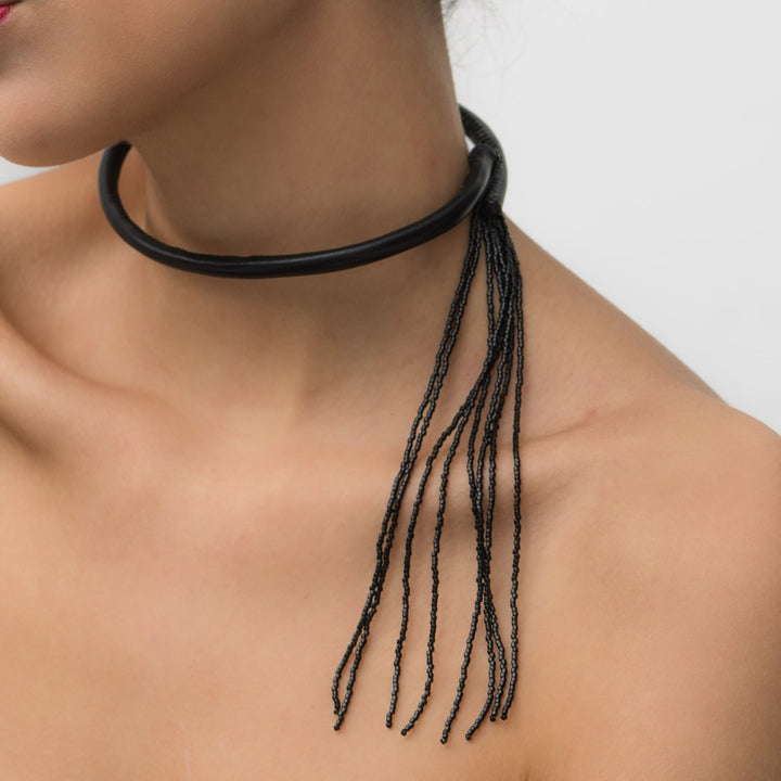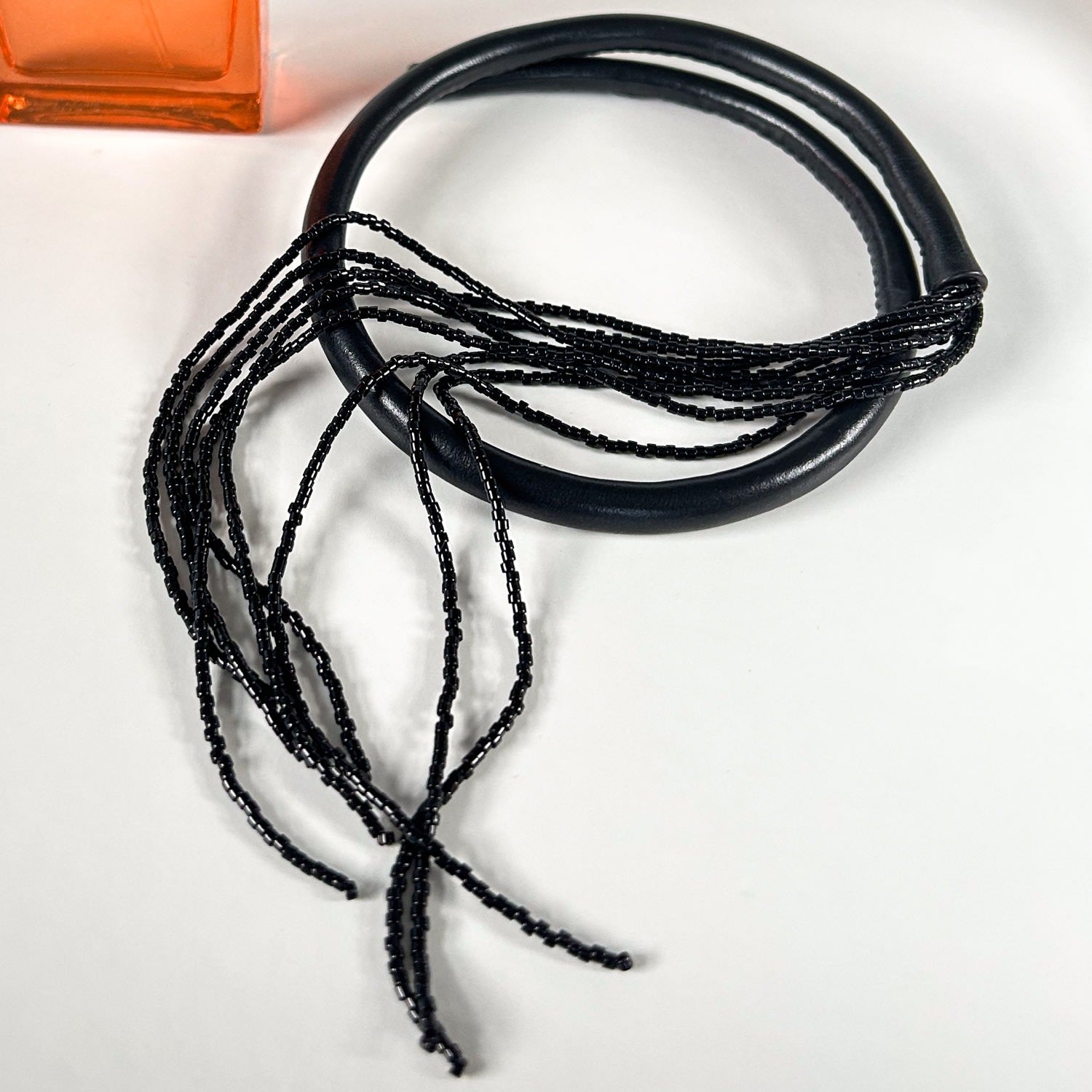 This Black Leather Choker With Beaded Tassel by Waiwai is a modern and edgy accessory. Handcrafted from soft black leather, it gracefully wraps around the neck and ends in cascading strands of shimmering black beads. Its versatile design allows the beaded tassels to be draped in the front or back, adding a unique touch of drama. It's lightweight and comfortable, perfect for anyone looking to redefine timeless style.