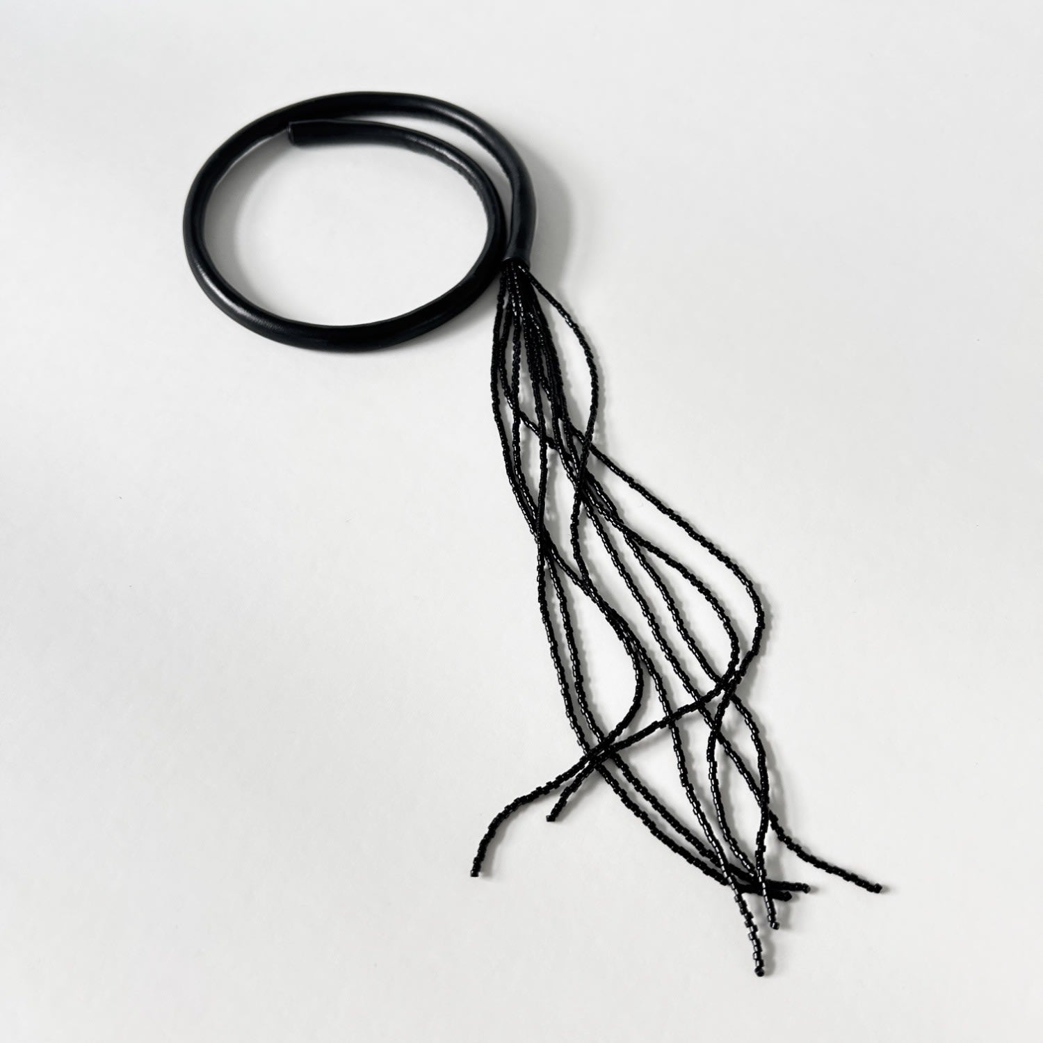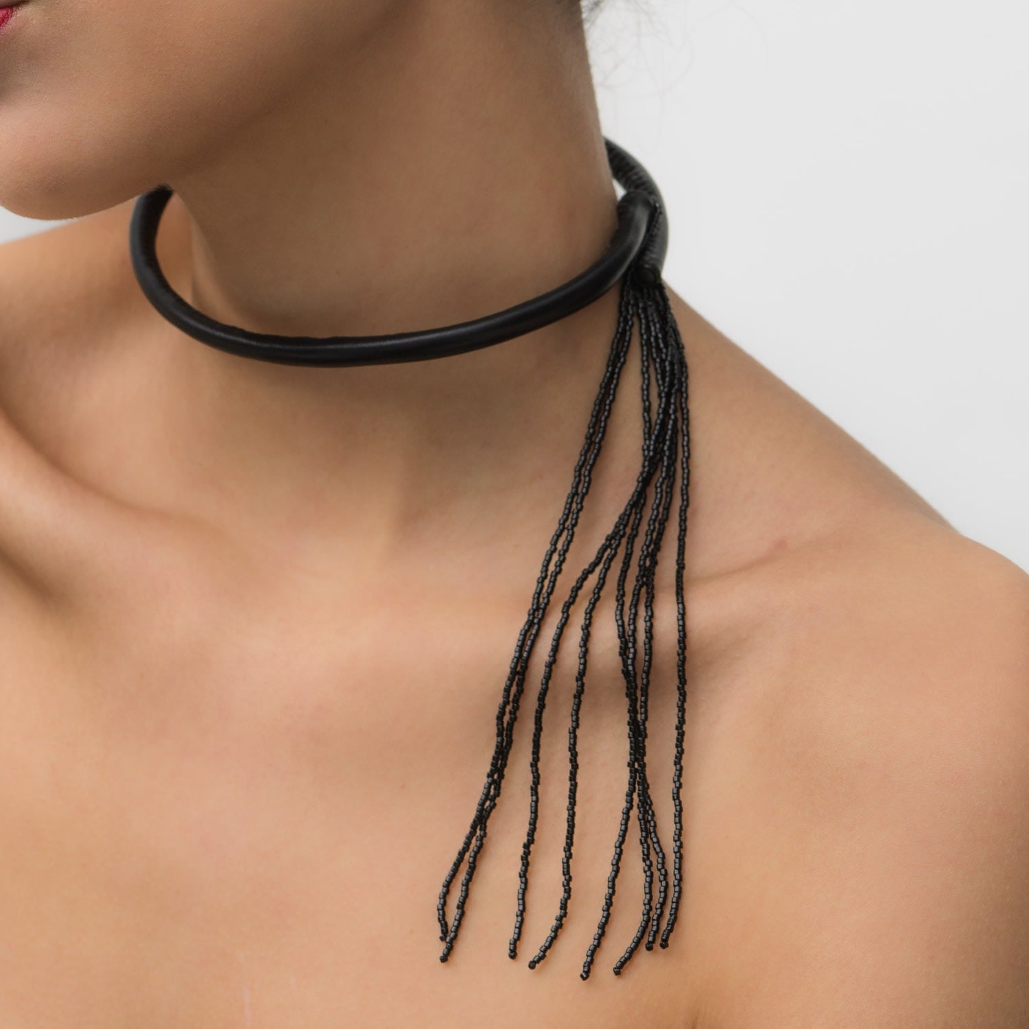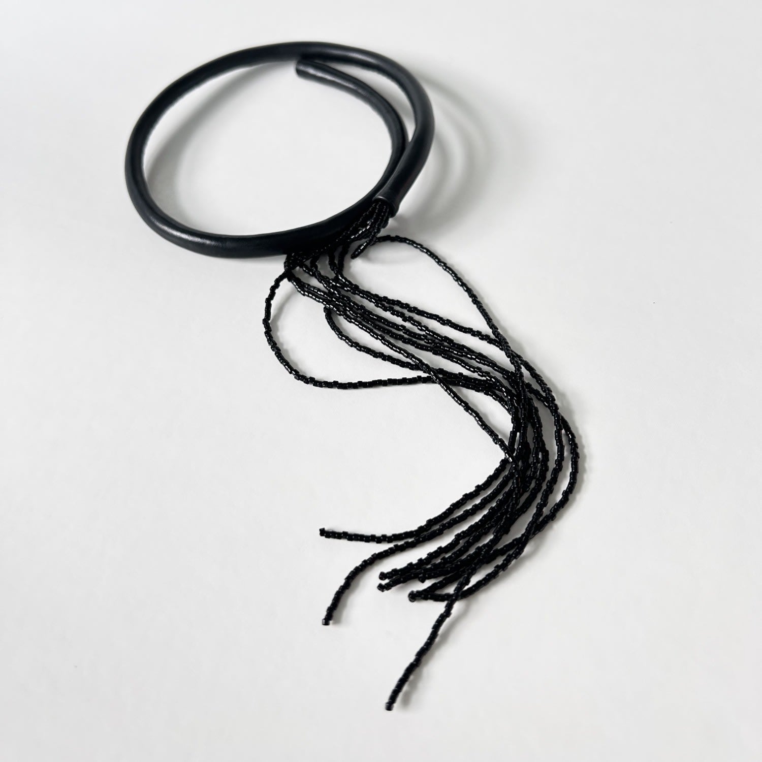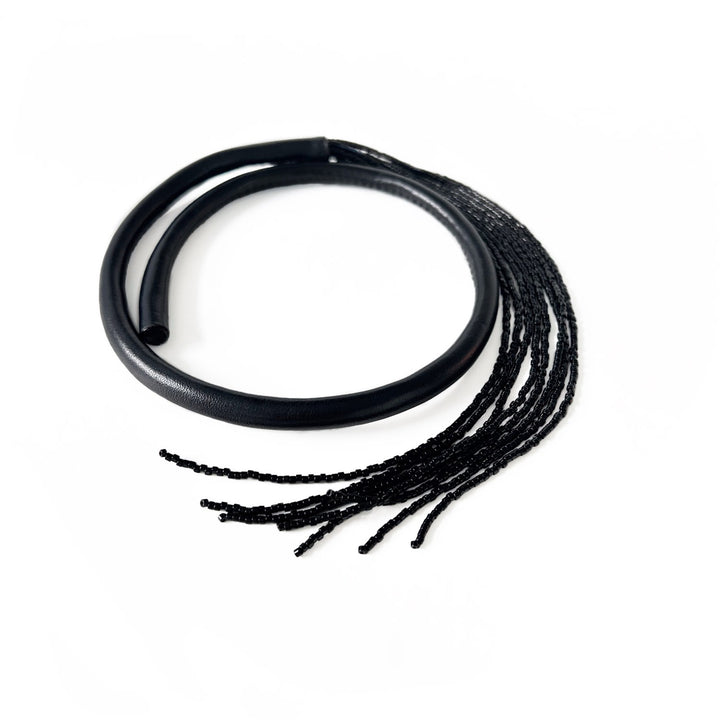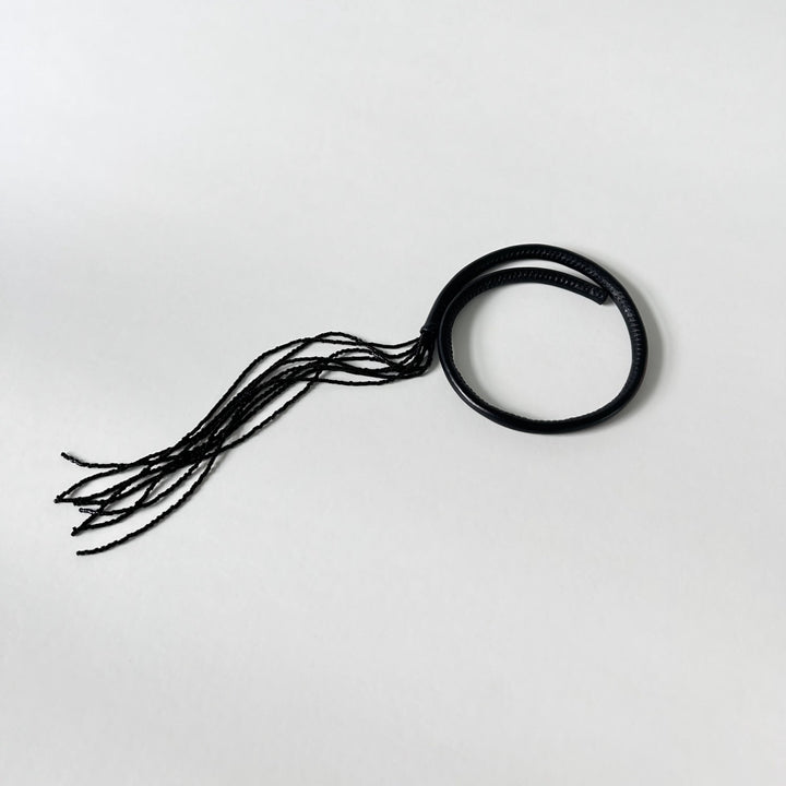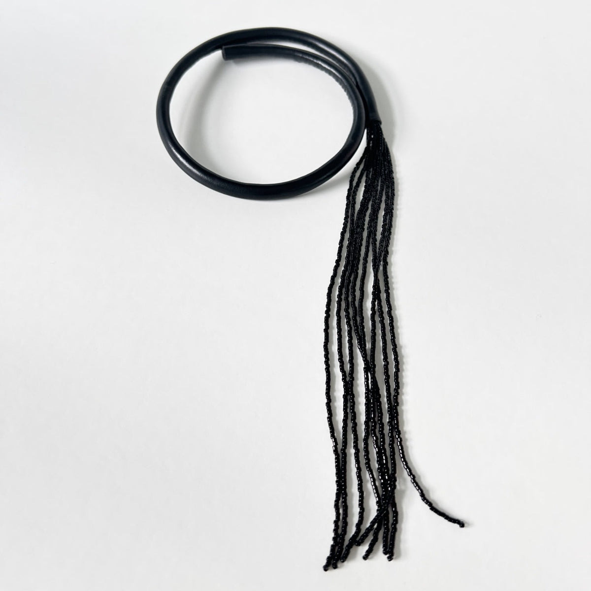 Handcrafted from smooth black leather with beaded tassels. It has no clasp.