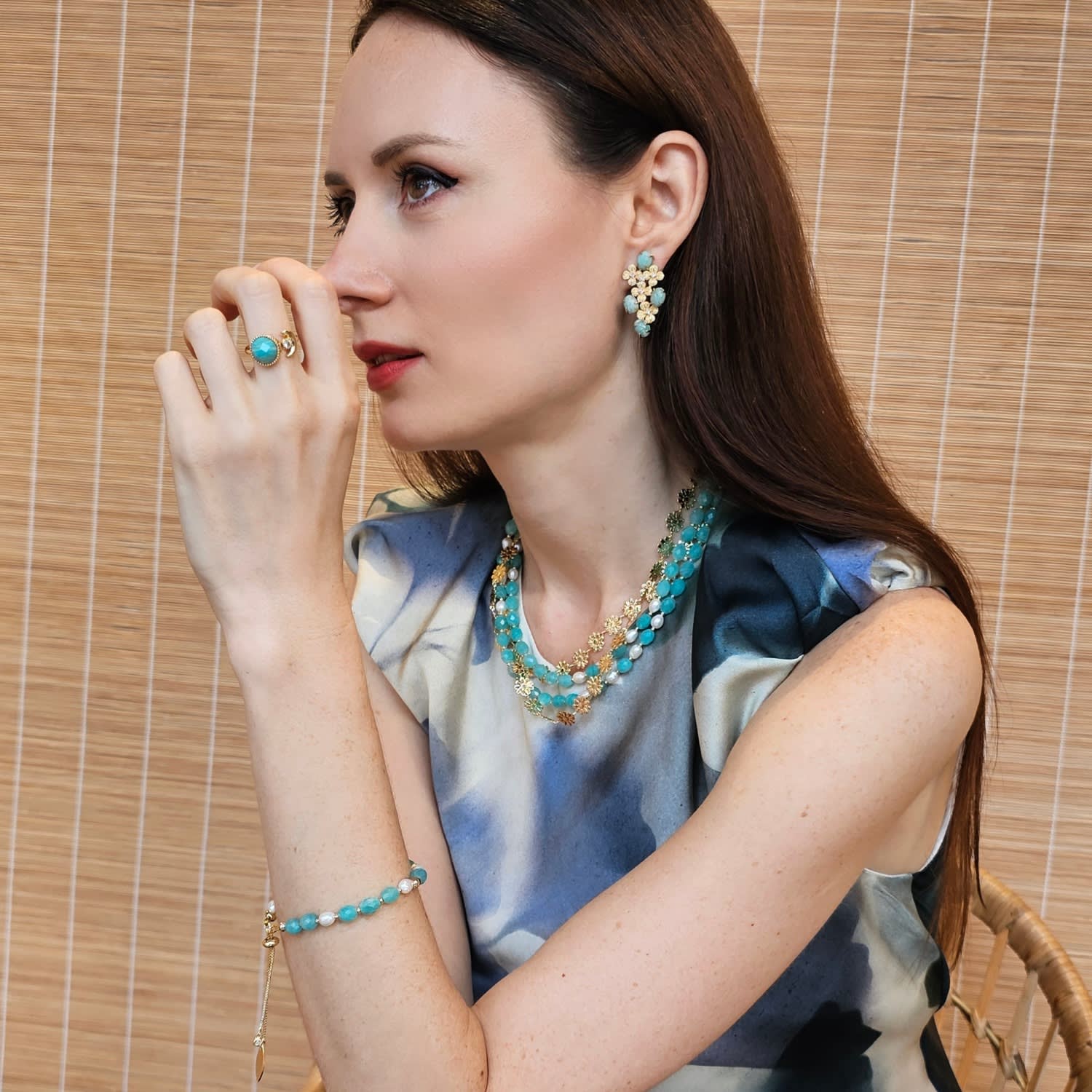This Amazonite With Freshwater Pearls Adjustable Bracelet by Farra is a charming piece that brings together the tranquil beauty of nature with refined elegance. It features a stunning array of polished amazonite beads in a serene blue-green hue, interspersed with luminous freshwater pearls. The beautiful contrast creates a look that is both elegant and eye-catching. The adjustable closure ensures a perfect fit, making it a versatile and delightful addition to any jewelry collection.