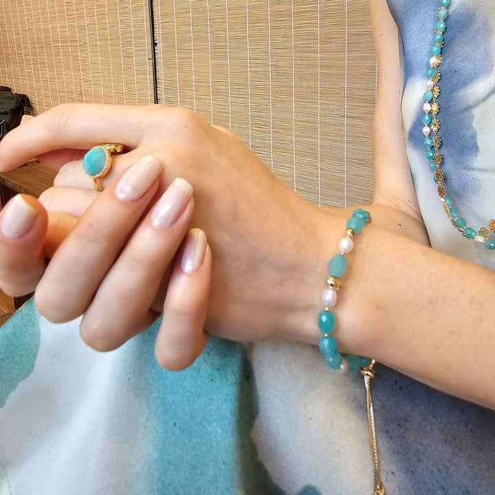 This adjustable bracelet is crafted with polished amazonite beads and lustrous freshwater pearls.