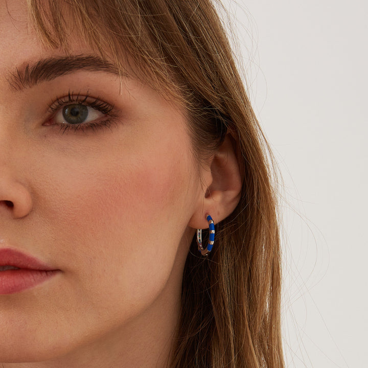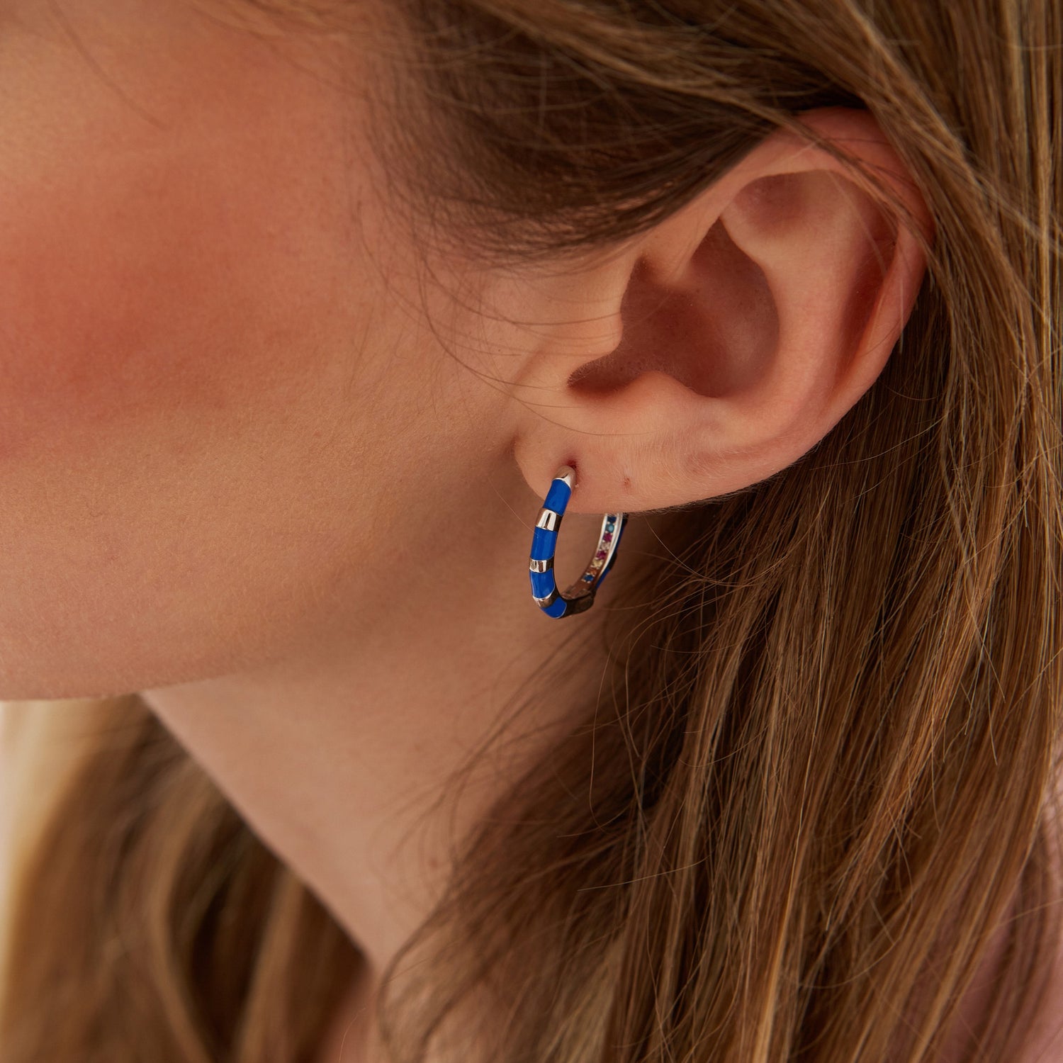 Enamel Navy Blue Fine Stripe Sterling Silver Hoop Earrings With Multi Color Zirconia Interior