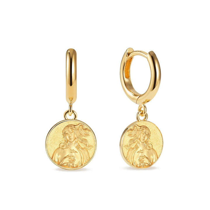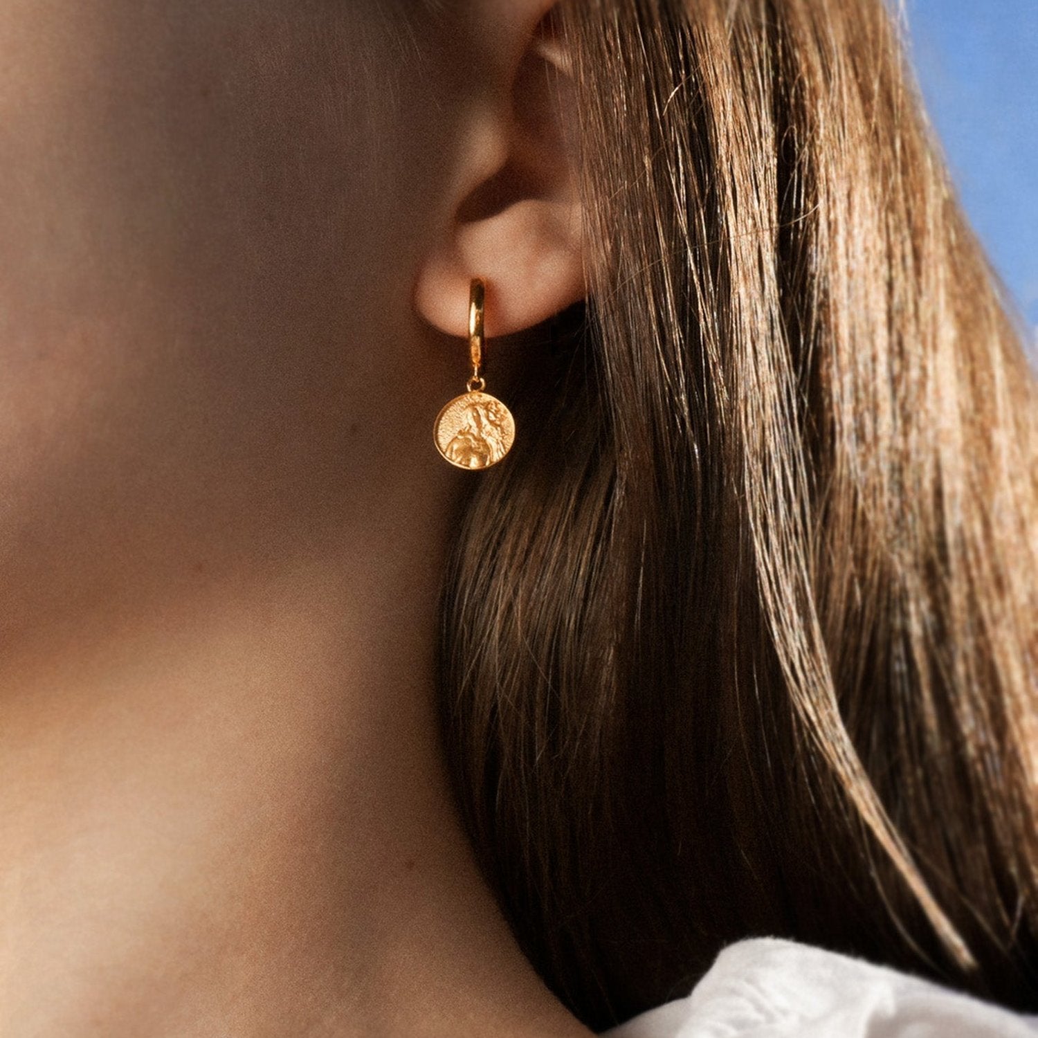 The Aphrodite Earrings Vermeil by Vermaye Switzerland are a tribute to the goddess of love, beauty, and femininity. These handcrafted gold vermeil huggie earrings feature a delicate medallion inspired by classical iconography. Made from 925 sterling silver and plated with 3 microns of real 14k gold, they are a durable and wearable ode to timeless symbolism. They are lightweight and can be worn alone or layered for a subtle yet meaningful addition to your look.