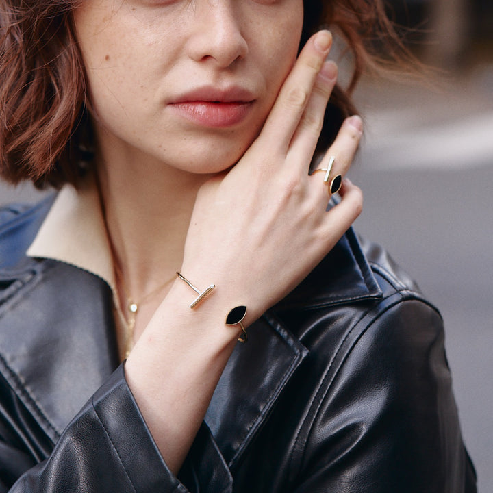 The Black Eyes Bangle by Retro Chic is a unique and captivating piece inspired by the shields of ancient Roman gladiators. It has a powerful and elegant aesthetic, with a gold-plated .925 silver band embellished with black agate and cubic zirconia. This bangle is a statement piece that blends ancient artistry with modern design, making it perfect for those who appreciate history and bold style. It's a sophisticated accessory that protects the wearer and adds a touch of mystique to any ensemble.