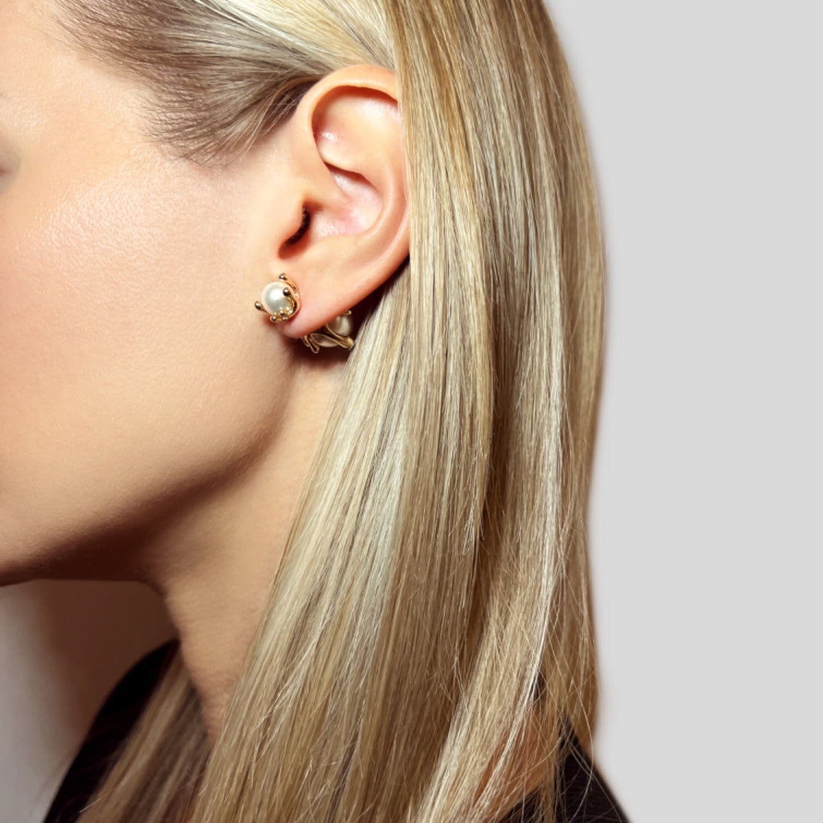 These Affectionate Shell Pearl Gold Plated Studs by Amoresea are a unique blend of elegance and bold design. They feature lustrous pearls held in an artistic, claw-like setting. The pearls' smooth, polished surface beautifully contrasts with the dynamic gold claws that wrap around them, giving the earrings an organic, nature-inspired look. These studs are a statement piece and a timeless classic, ideal for adding an avant-garde yet sophisticated element to any outfit.
