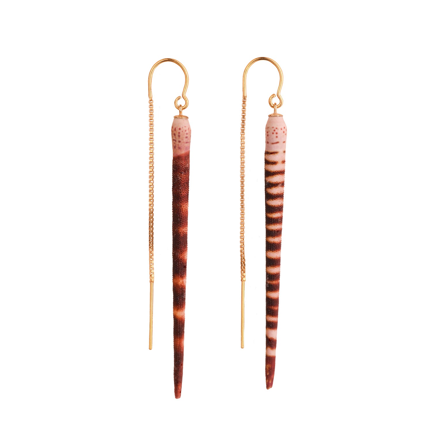 These earrings are crafted with a pristine sea urchin spine duo and are made from recycled 14K Gold-Filled materials. The approximate length is 6.5 cm.