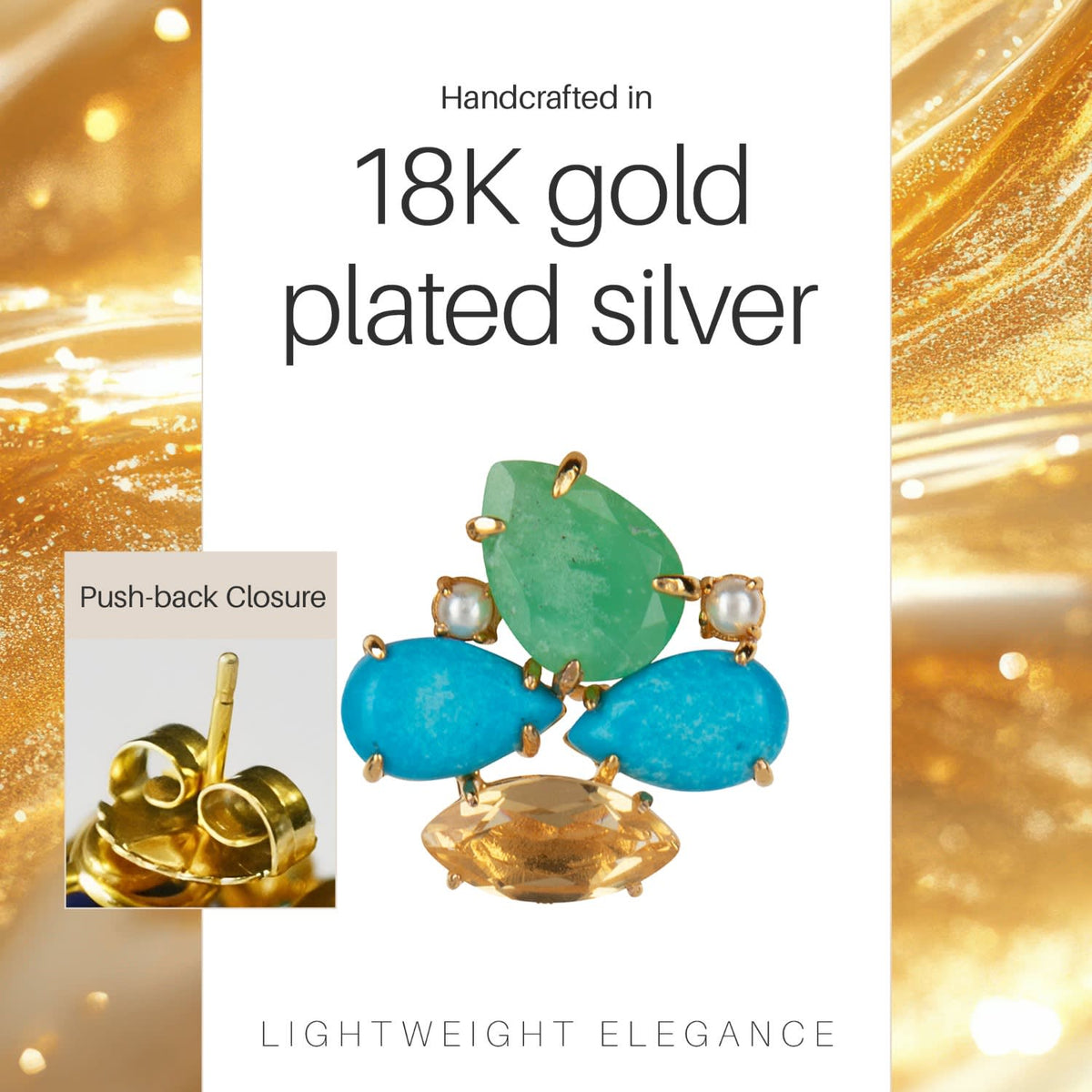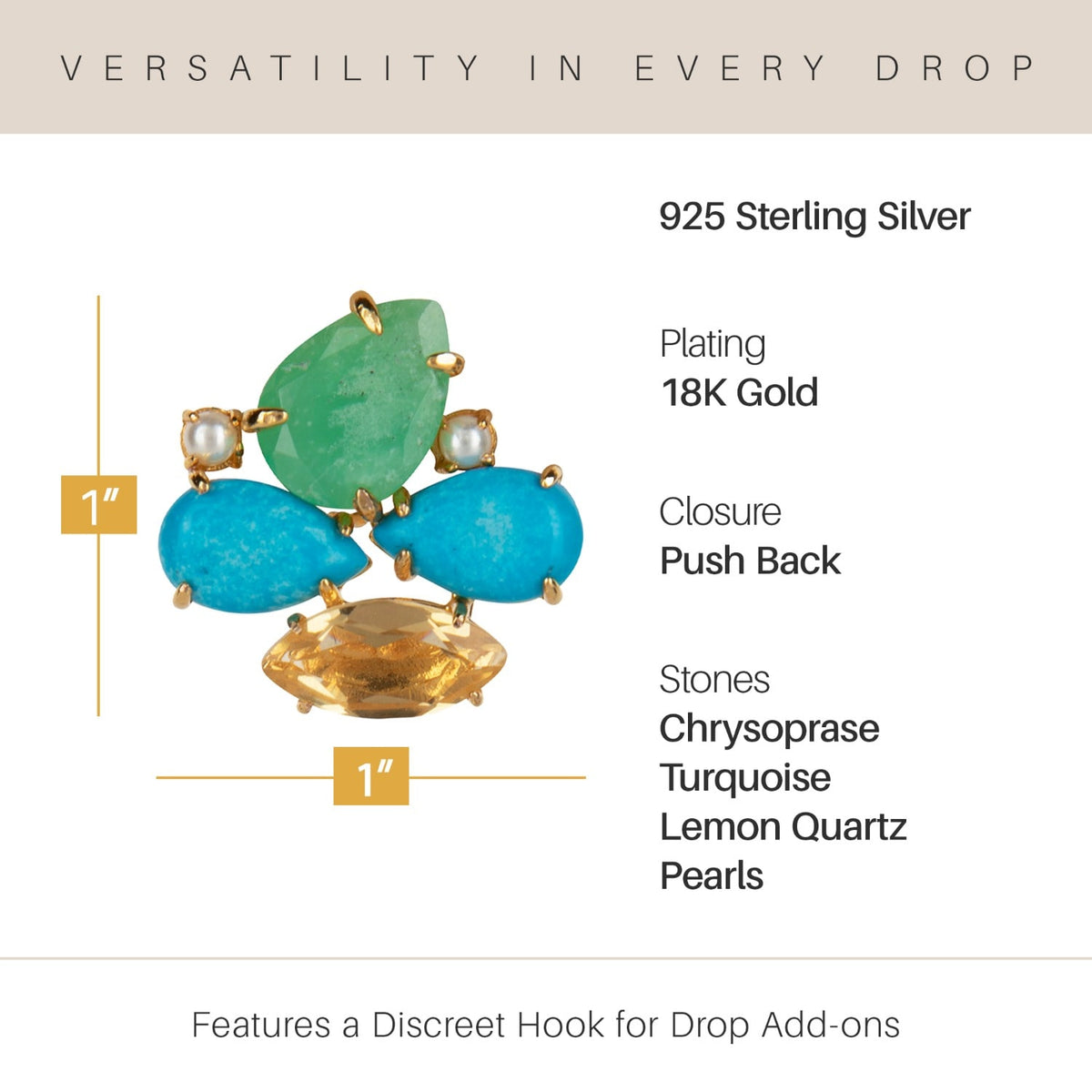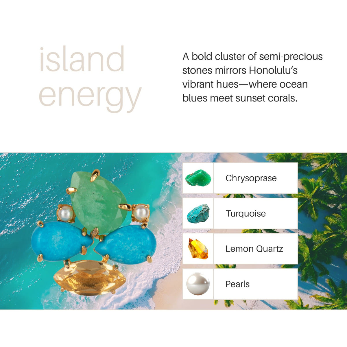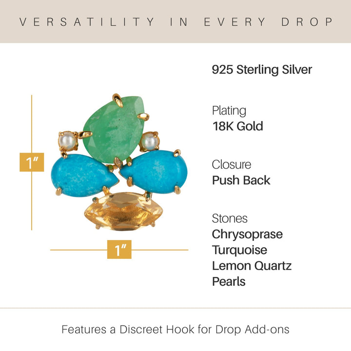These Honolulu Studs Push Back by Bounkit bring the vibrant spirit of the islands to life. Handmade in New York from sterling silver with 18K gold plating, these earrings feature a radiant mix of chrysoprase, turquoise, lemon quartz, and pearls. They have a discreet hook for versatile styling: they can be worn as simple studs or with a drop for evening wear.