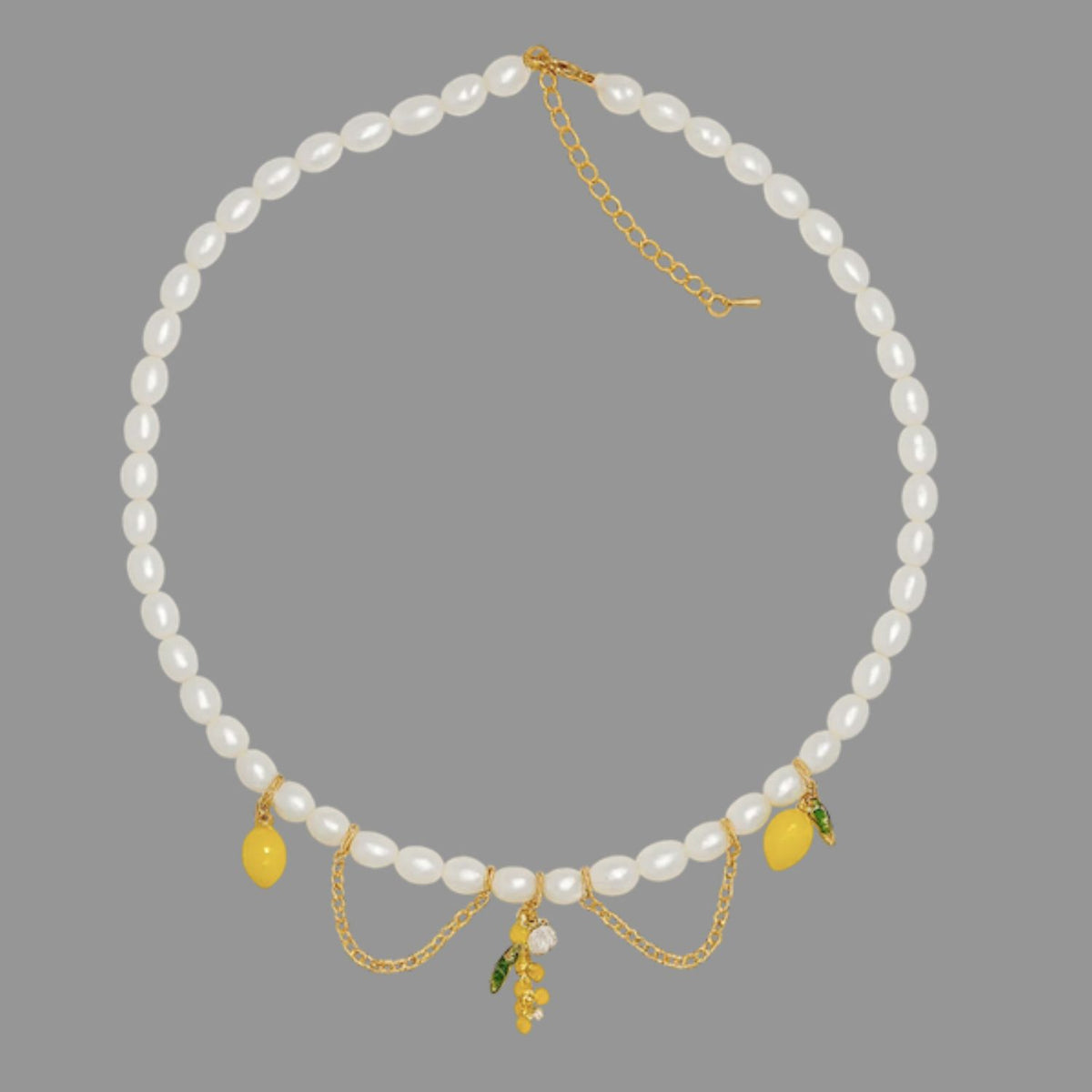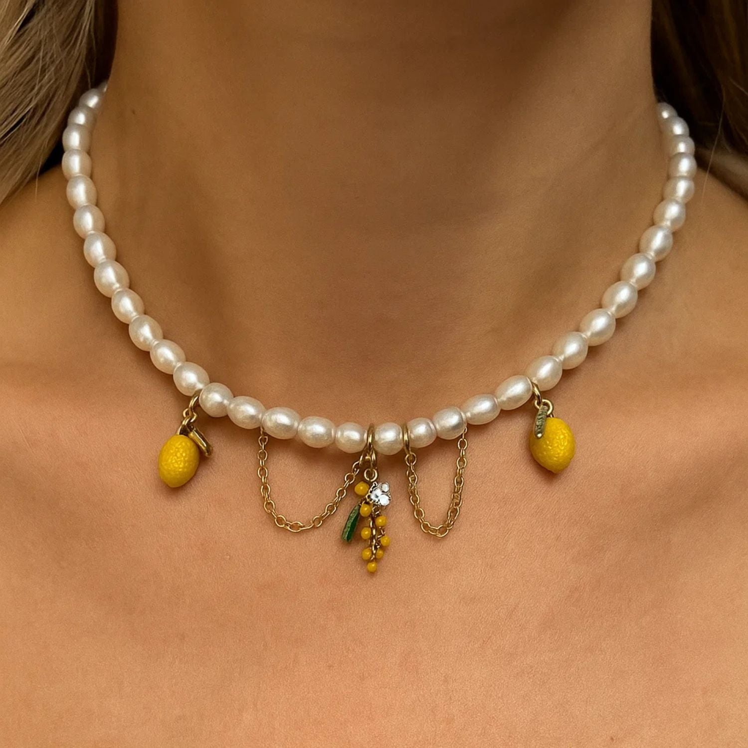 This necklace is handmade with AAA quality natural freshwater pearls. It also features sunny lemon charms and other real nature elements, with a bamboo-style gold-plated chain.