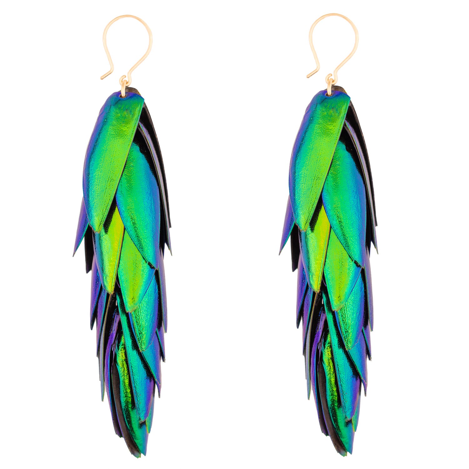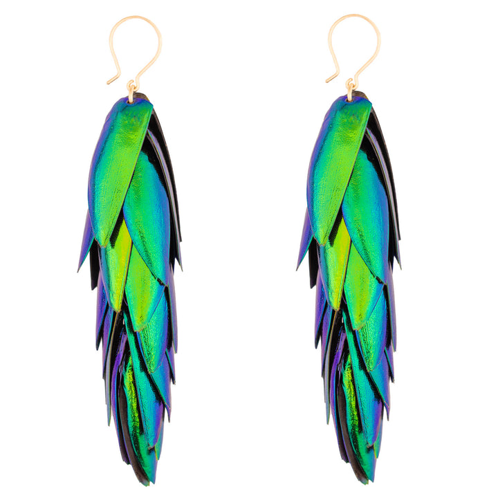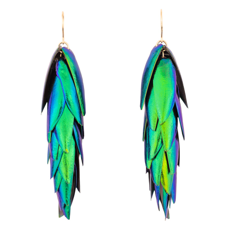 These drop earrings are made with ethically sourced, recycled natural beetle wings, a recycled 14K gold-filled ear wire, and sterling silver.