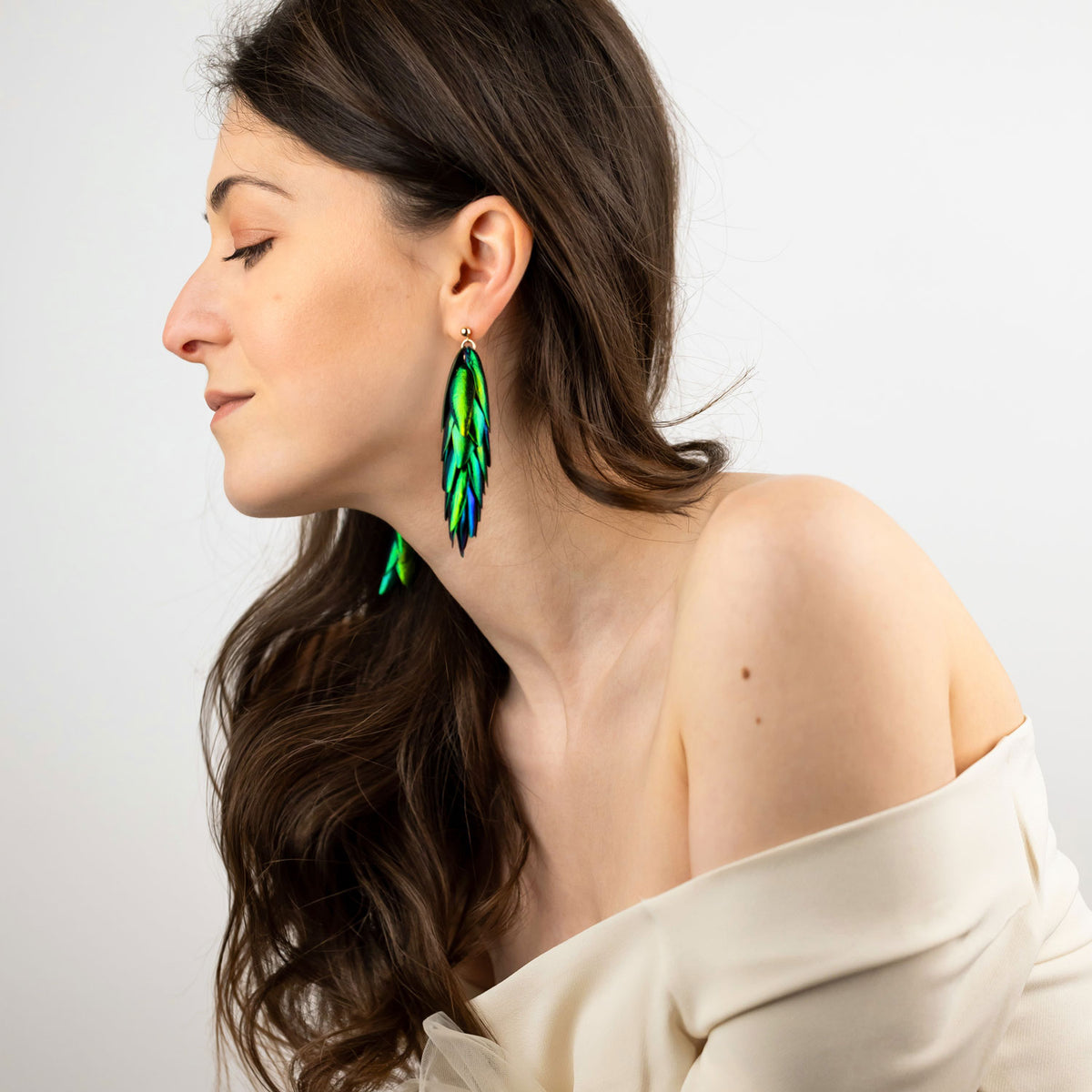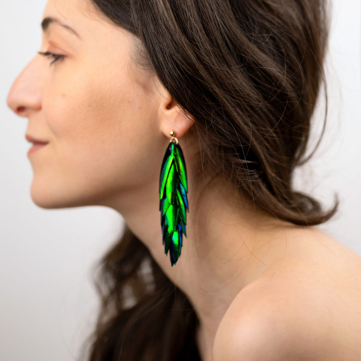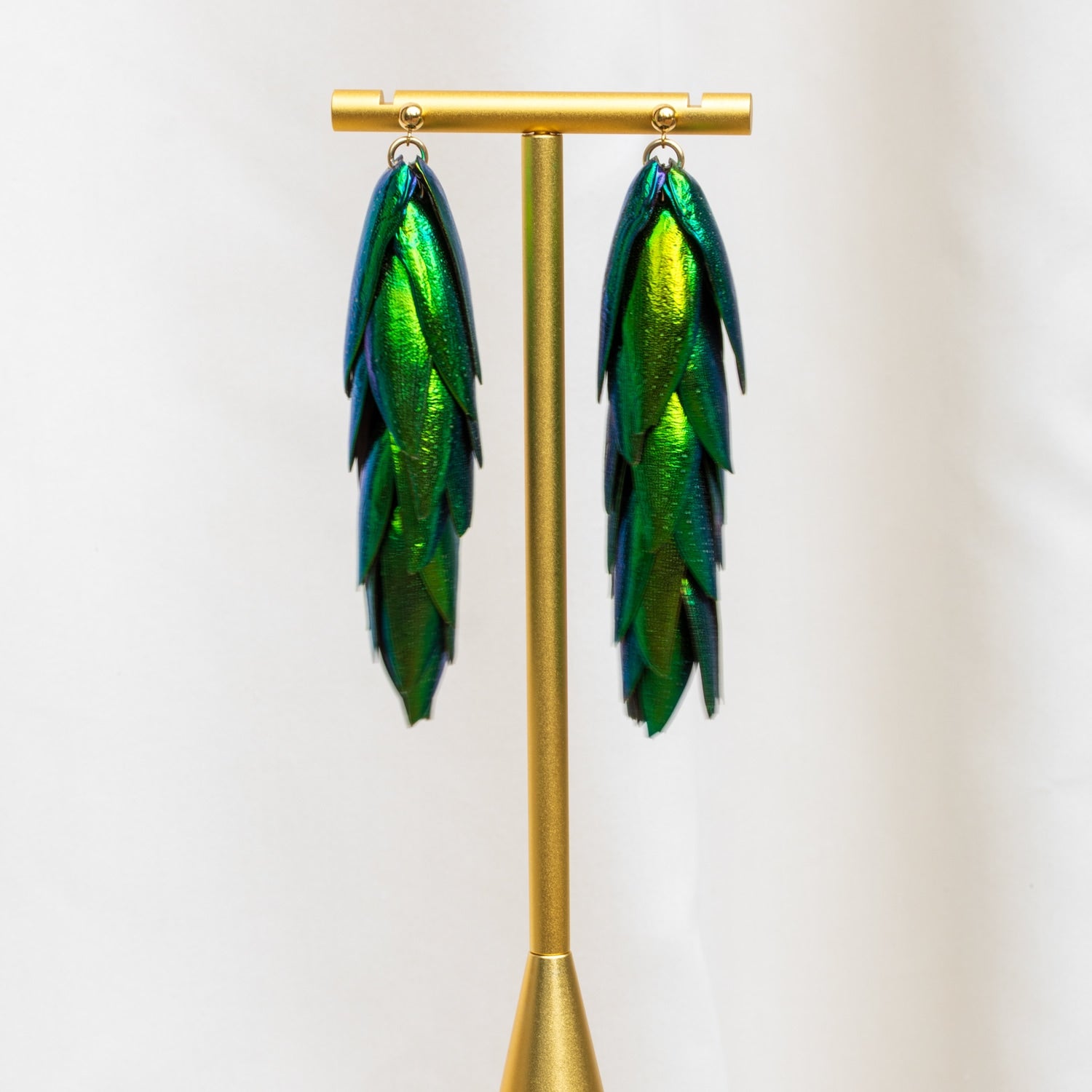These earrings are made from recycled 14K Gold-Filled material and recycled natural beetle wings that are ethically sourced. The wings are naturally metallic green.