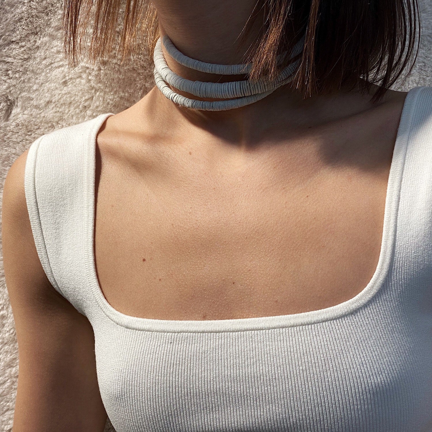 This choker is made of leather and has a continuous coil design. It is white and has no clasp.