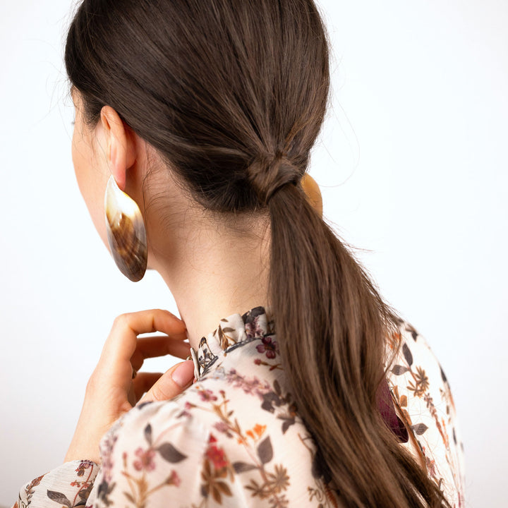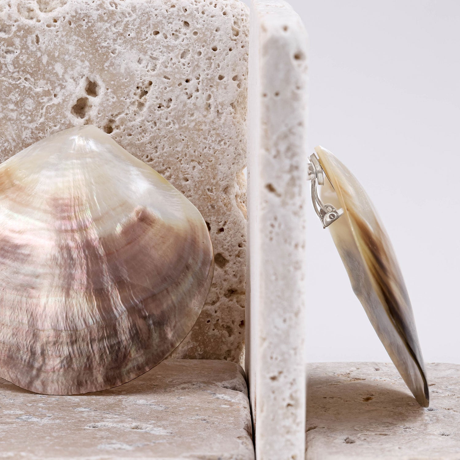 These earrings feature recycled seashells with silver-plated ear clips and silicone protectors. They are handmade.