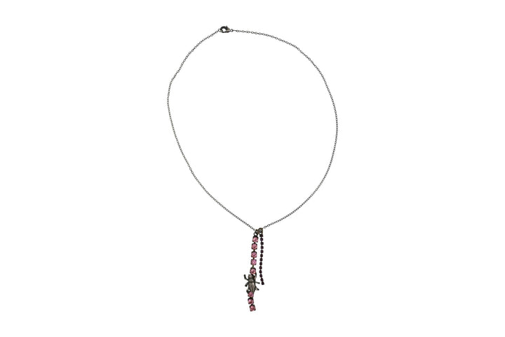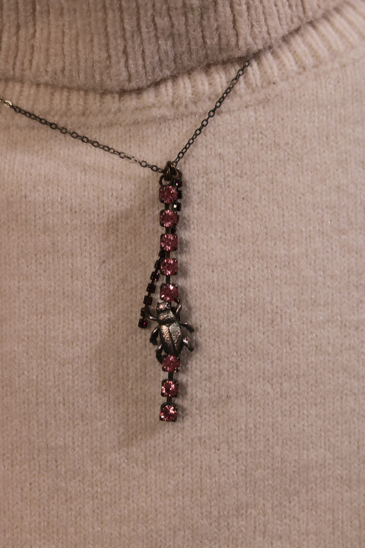This necklace is made with antiqued sterling silver-plated, nickel-free brass and features premium Austrian crystals. The fine chain has a dangling pendant with two lengths of crystals and a small bug motif at the base.