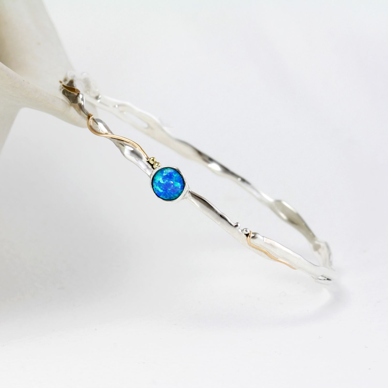 This Organic Delicate Opalite Bangle by Isla Silver captures fluid elegance with its flowing silver silhouette and glowing opalite centerpiece. Interwoven with fine gold wire, it strikes a harmonious balance of delicacy and color—perfect for daily wear or gifting.