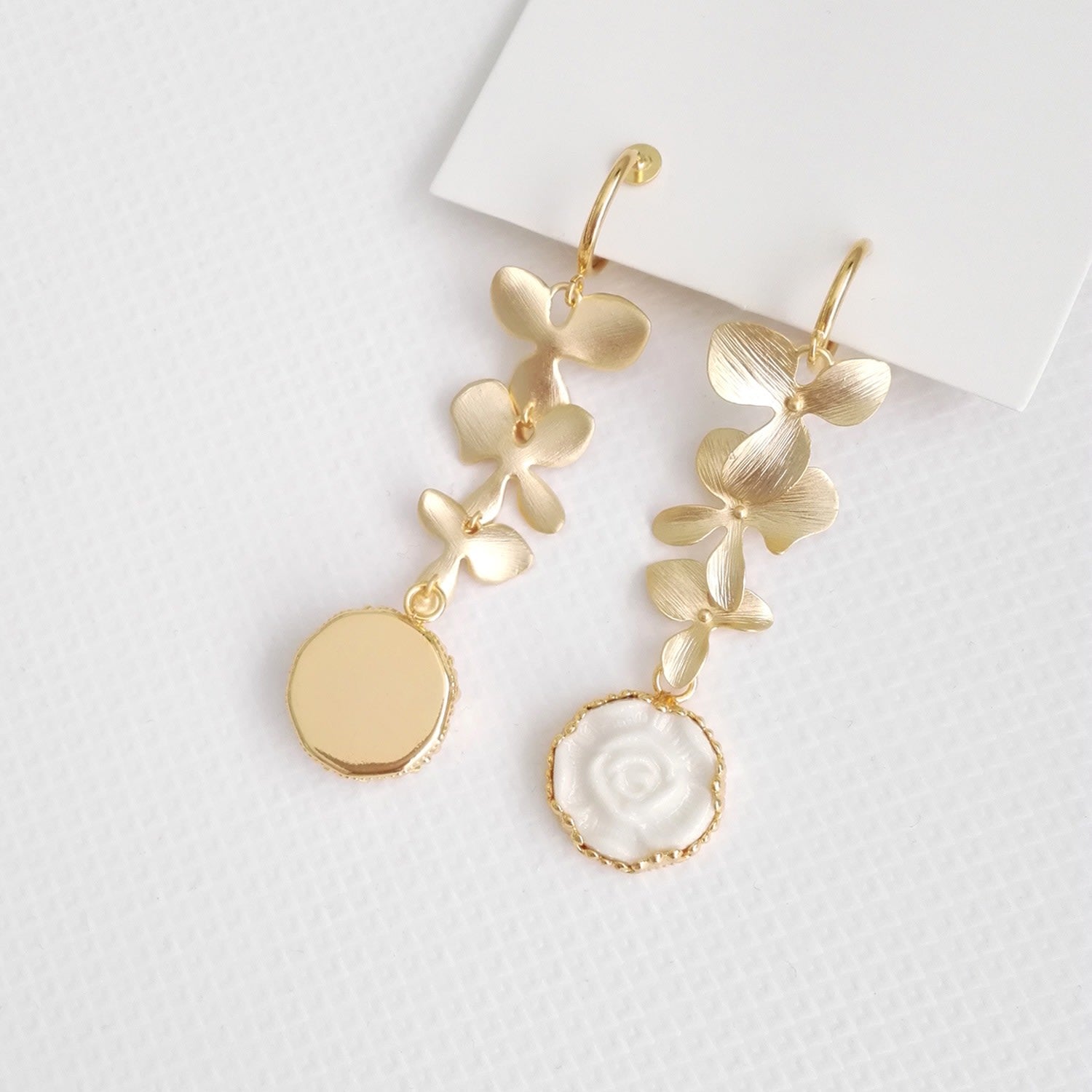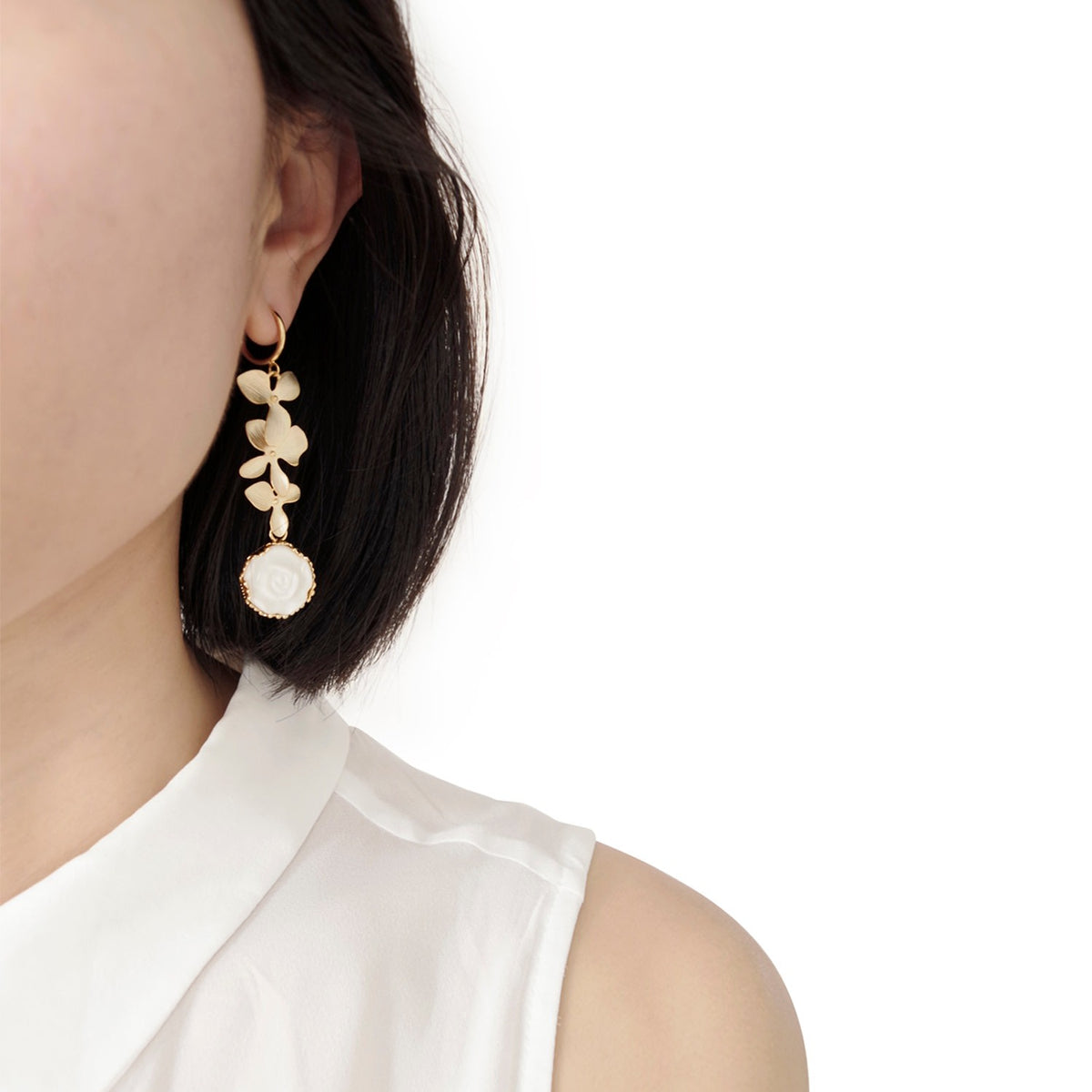 The Porcelain Moonlight Rose And Triple Leaves Clip-On Earrings by Poporcelain are a pure, feminine, and romantic accessory. Inspired by nature, they feature handmade porcelain moonlight rose cabochons and triple golden leaves. These clip-on earrings are friendly to all ear types. The intricate design tells a romantic story, and the delicate craftsmanship makes them a beautiful and elegant addition to any look.