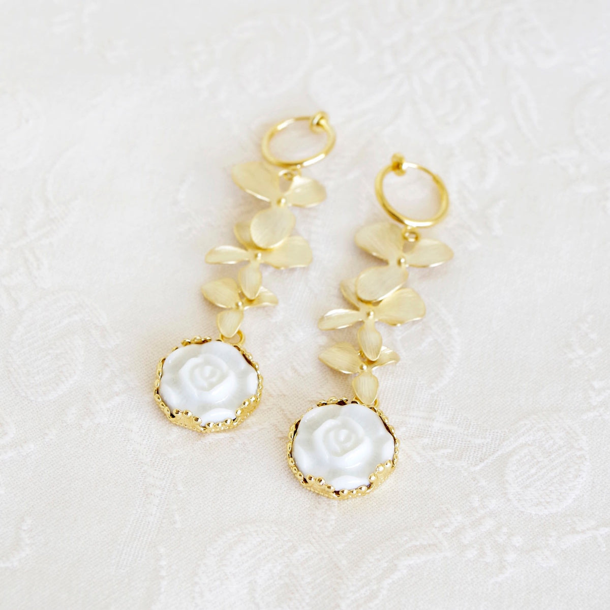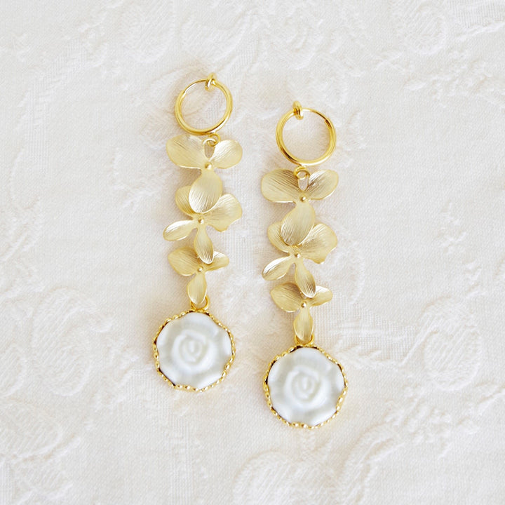 These earrings feature handmade porcelain moonlight rose cabochons and are made with gold-plated brass. They have a gold-plated clip-on fastening.