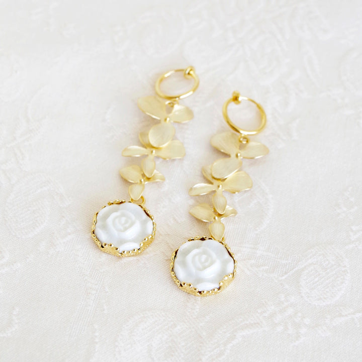 Porcelain Moonlight Rose And Triple Leaves Clip-On Earrings